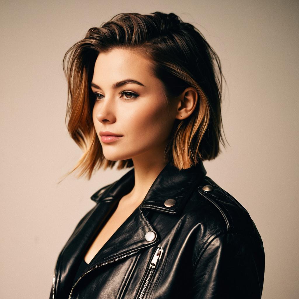Taper Cut hairstyle on female model, wearing modern jacket, in urban rooftop, captured in fashion editorial style with natural tone.
