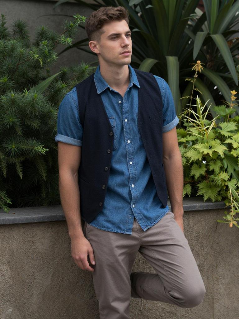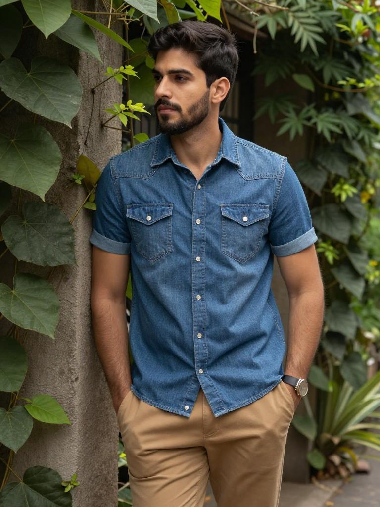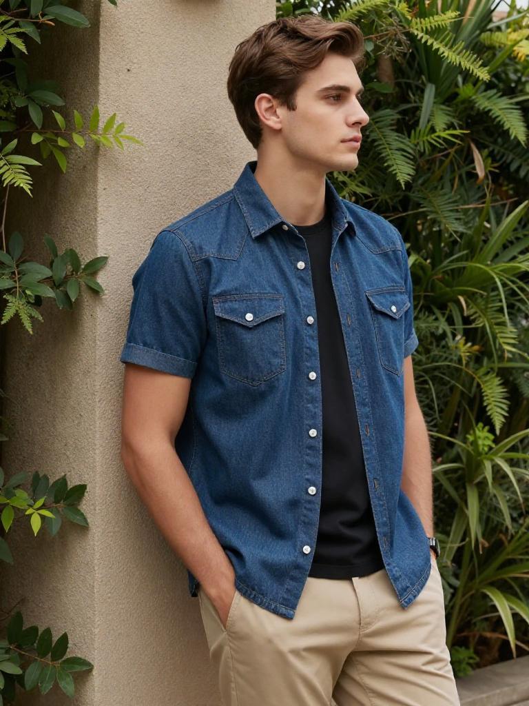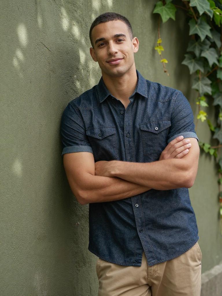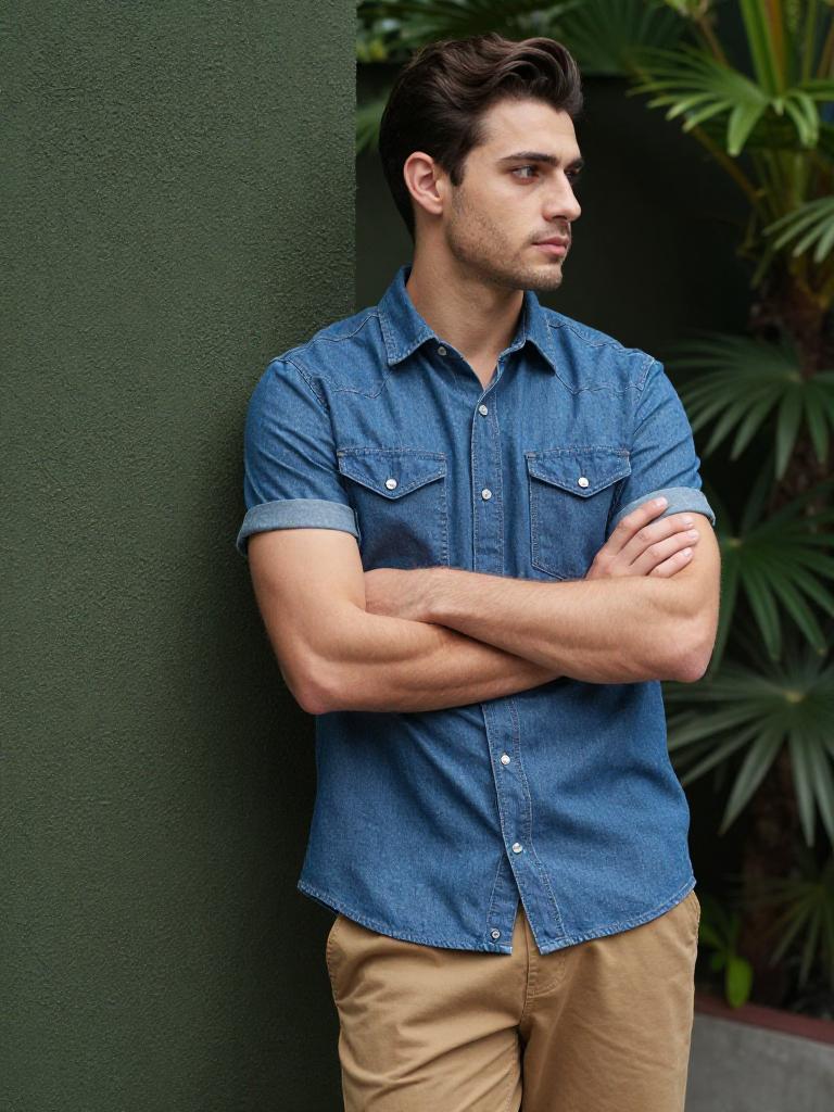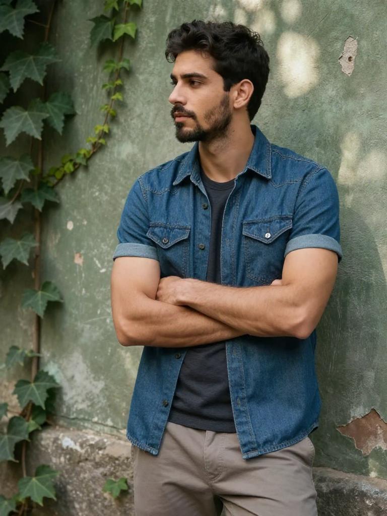 Man wearing denim t-shirt, relaxed outdoor portrait of a young man in a short-sleeve denim shirt, lightly stubbled man with side-parted dark hair styled in textured navy denim shirt unbuttoned at top, paired with khaki pants standing with one shoulder to the wall, head turned looking away against brick wall mostly hidden by leafy vines, moody natural light, lifestyle fashion photography, high resolution