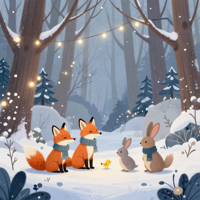 Animalitos in winter wonderland setting, cozy small animals like foxes, rabbits, and birds wearing tiny scarves amidst snowy trees and twinkling lights, peaceful and enchanting vibe, soft textures, cool tones mixed with warm highlights, storybook illustration style.