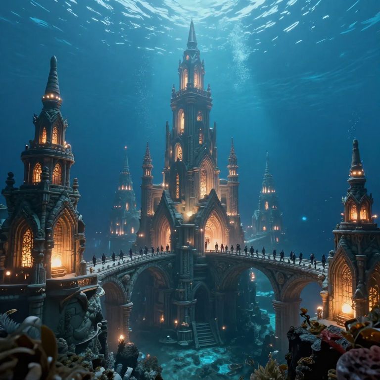 A luminous, otherworldly city emerges from the depths of the ocean, its towering spires crafted from ancient stone and glowing with warm, ethereal light, while figures traverse its arched bridges and cavernous pathways, defying the weightlessness of the underwater realm.