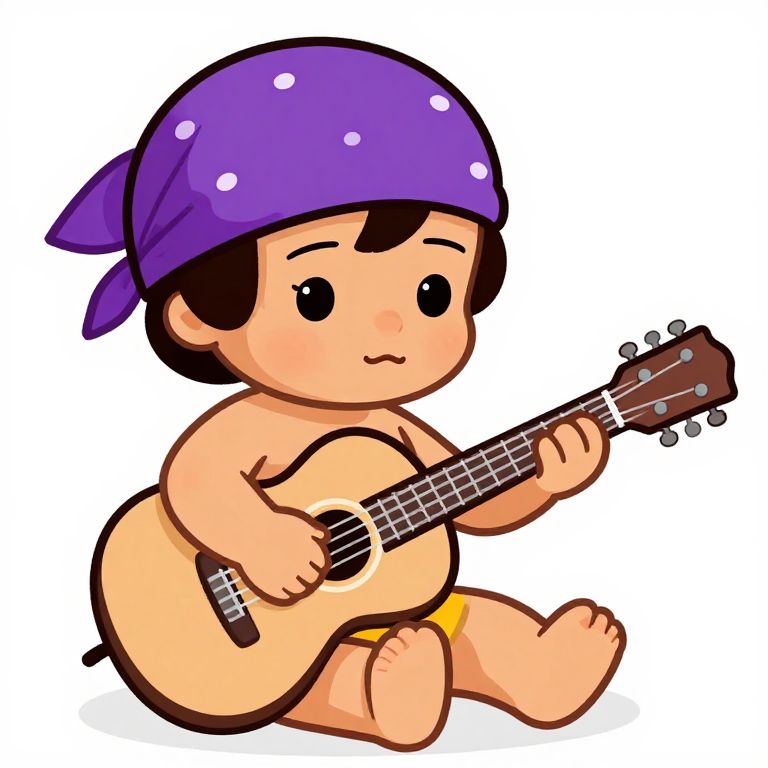 Instrumental jimmy Hendrix as a baby. with a purple bandana on his head.sat on the floor holding a guitar. white background. cartoon style,