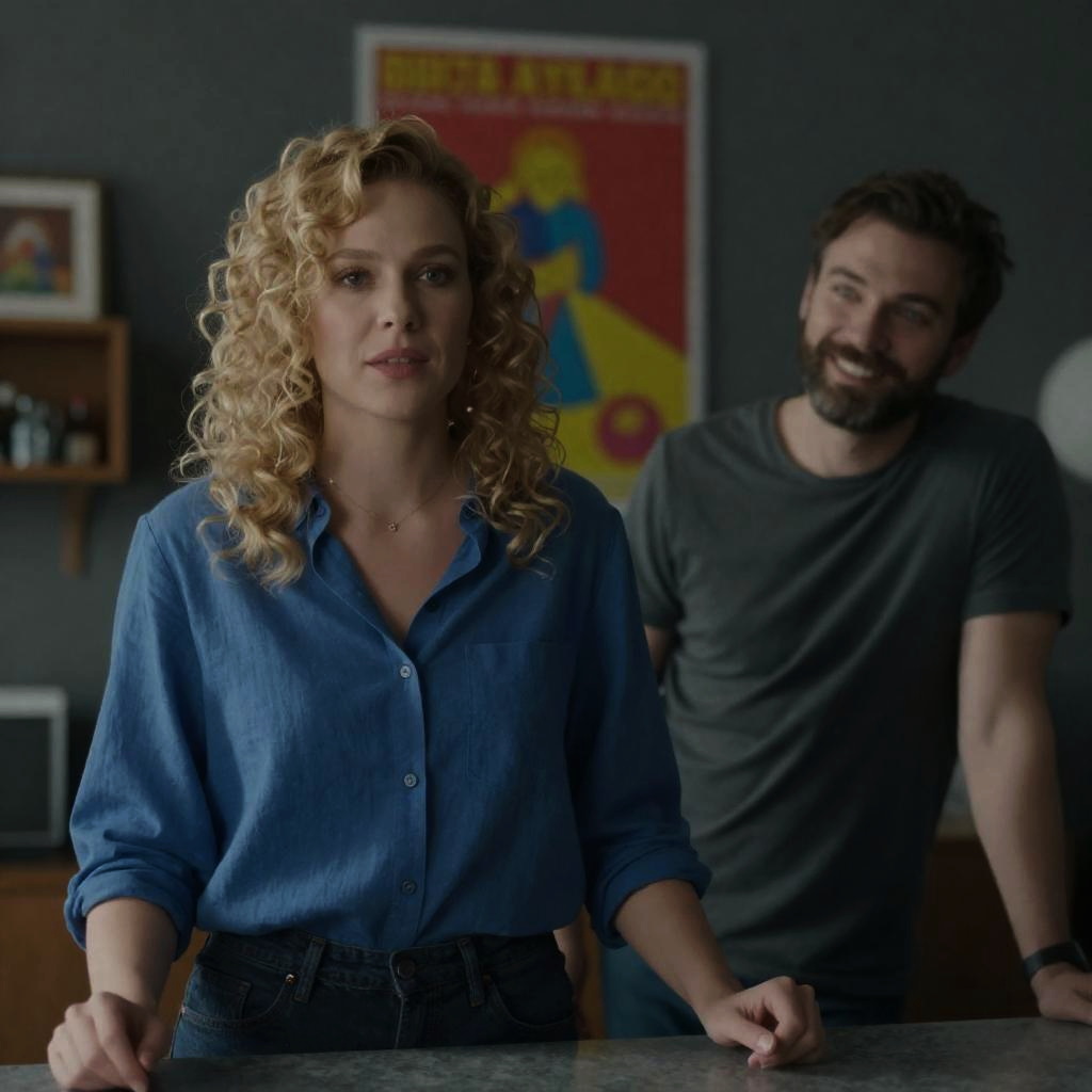 Photograph of a blonde woman with curly hair, wearing a brown tank top and red cardigan, and a man with short curly hair, wearing a striped shirt, standing in a hallway. The man is holding a white object and looking down at it, while the woman looks down at it with a gentle smile. Warm lighting, wooden walls, and a lamp in the background. Both standing close to each other.