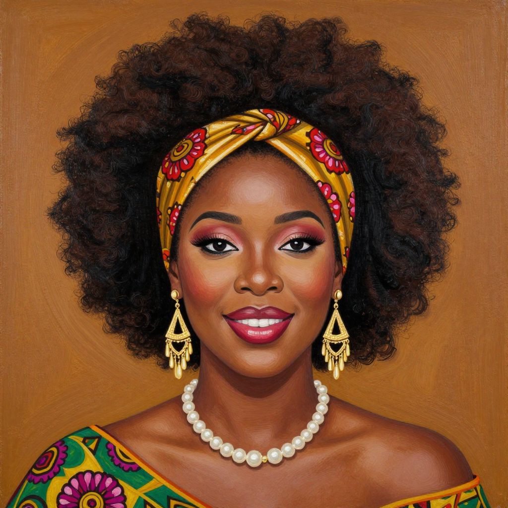 Vibrant hand-painted portrait featuring a woman with voluminous afro puffs adorned with a golden headscarf embellished in red and pink patterns, complemented by dangling gold earrings and a pearl necklace, set against a warm, textured background with earthy tones.