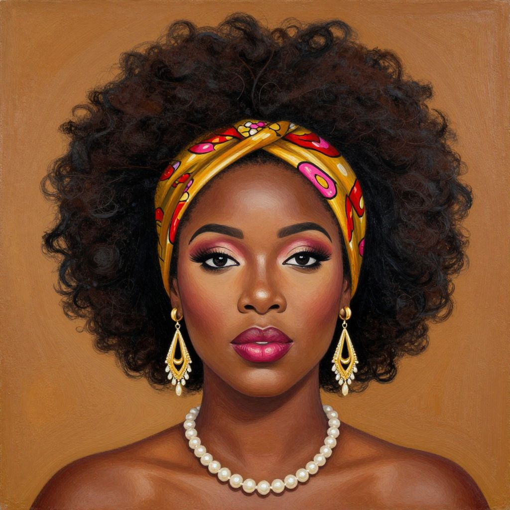 Digital painting of a beautiful Black woman with dark brown skin, full lips painted pink, and striking brown eyes. She has a large, curly afro adorned with a yellow headband featuring red and orange patterns. She wears gold, dangling earrings and a white pearl necklace. Her makeup includes winged eyeliner and subtle eyeshadow. The background is a warm, solid brown. The artwork style is realistic with a slight hyper-realistic touch, emphasizing her elegant and confident appearance. The texture of her hair and the sheen on her skin are particularly detailed.