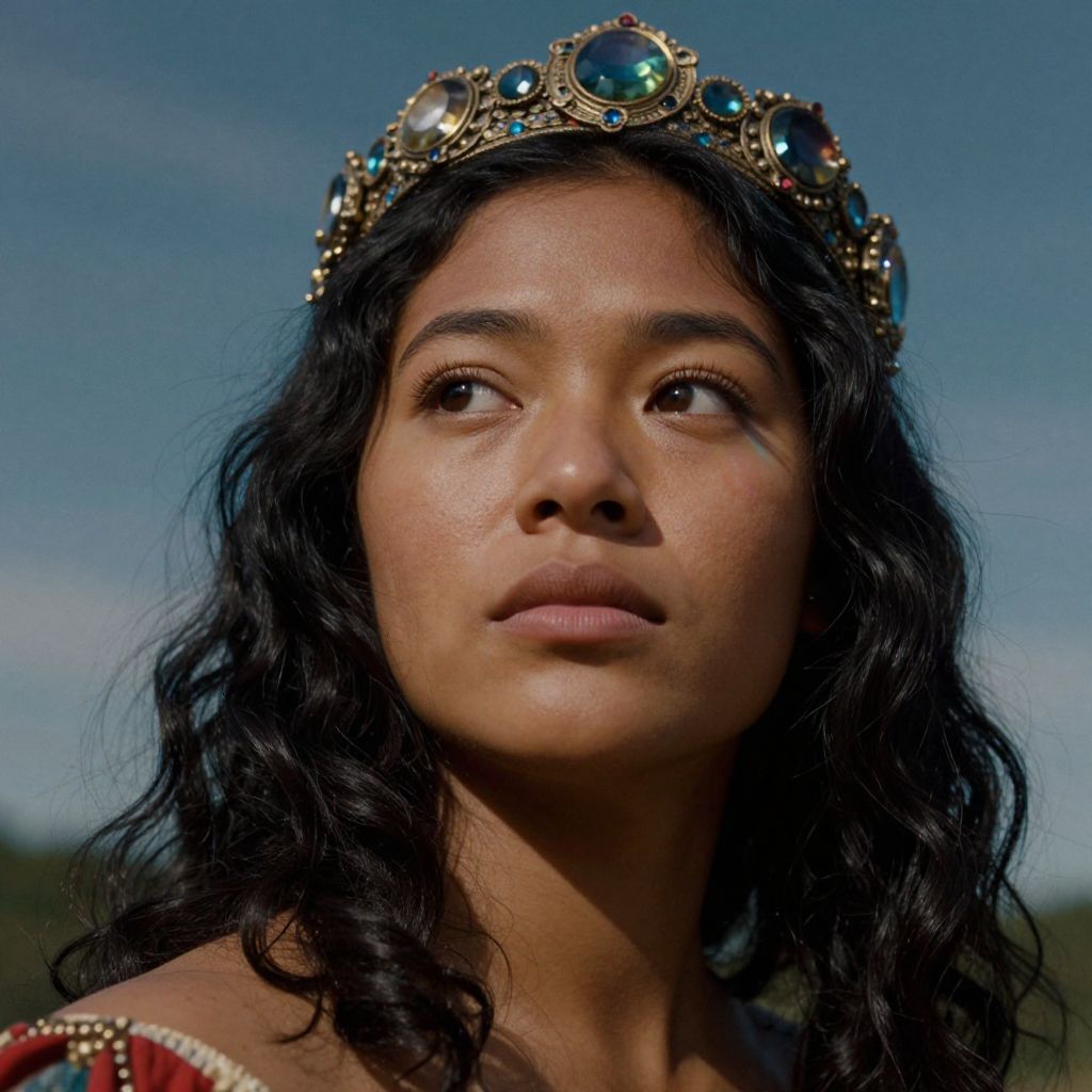 Craft a photorealistic portrait reminiscent of Renaissance art with digital surrealism. Capture a Micronesian woman in her late 20s with olive skin and wavy jet-black hair cascading to her shoulders. She dons an ornate crown-like headpiece adorned with gemstones, casting prismatic light on her face as she gazes pensively into the distance. Use a unique low-angle perspective just above the ground, creating a shallow depth of field that emphasizes her enigmatic expression and evokes emotions ranging from curiosity to introspection.
