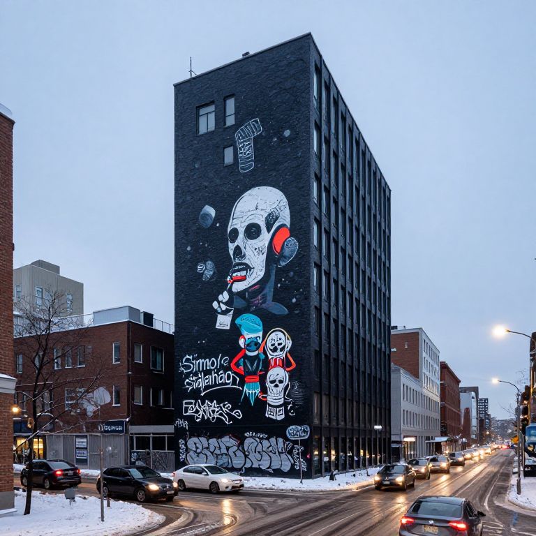 Photograph of a dark, six-story building with a large, colorful street art mural featuring a skull and abstract elements, set against a snowy urban street