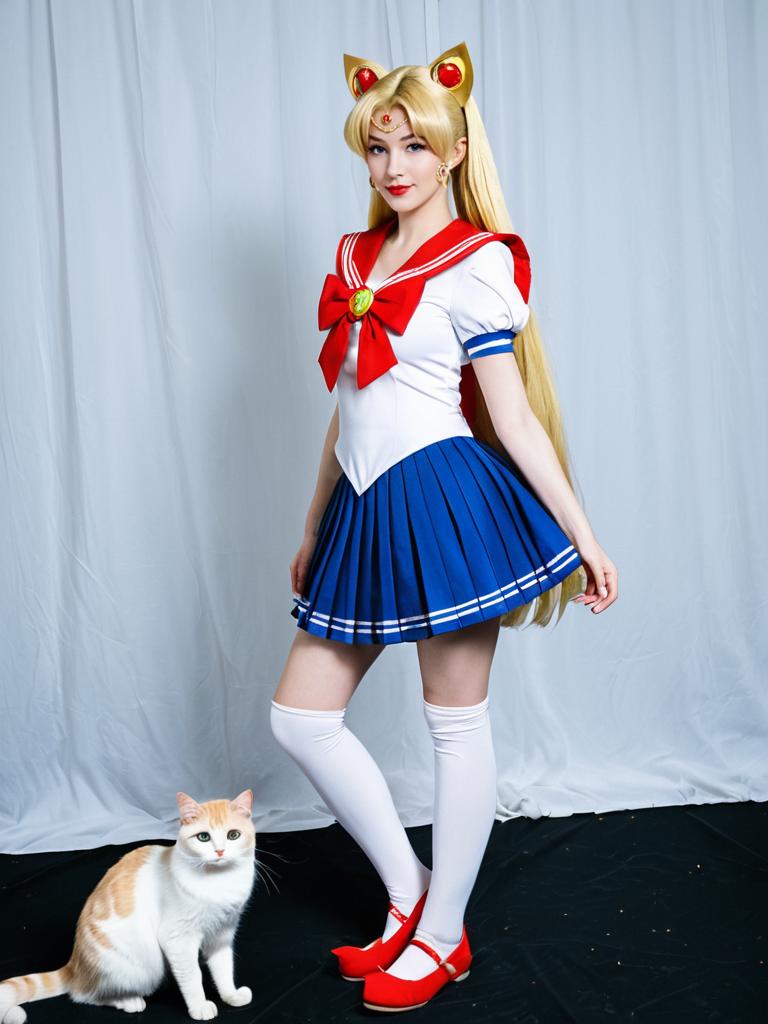 Photo-realistic cosplay photo of person in artemis (sailor moon) costume. 1girl, blue eyes, blonde hair, long hair, very long hair, hair bow, pleated skirt, red bow, white cat, crescent facial mark, animal. full body shot