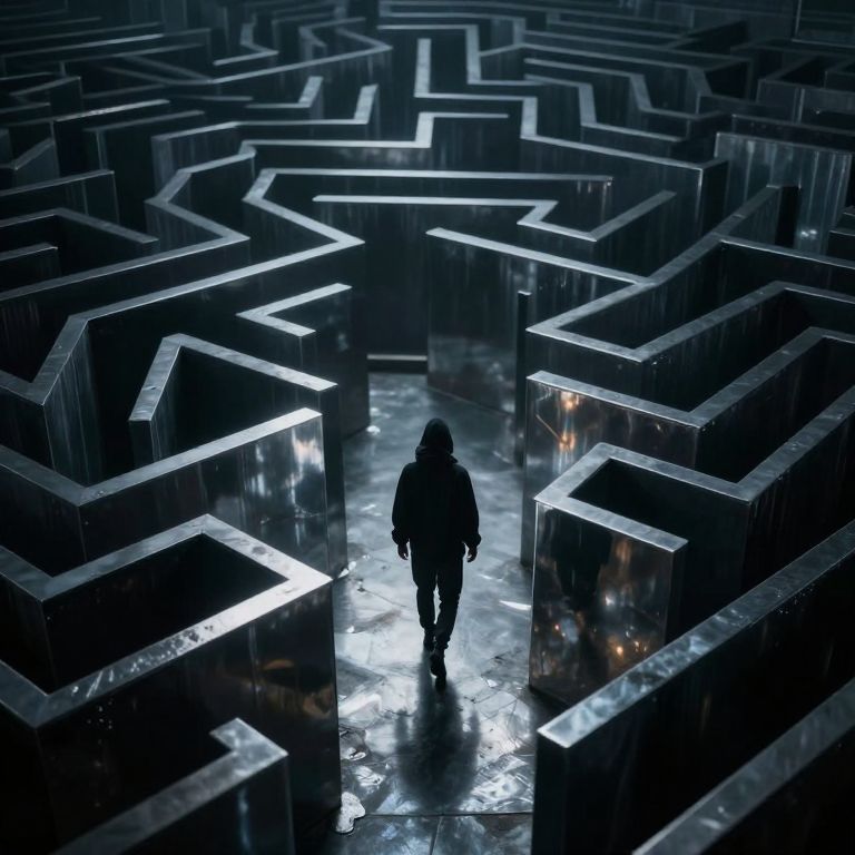 Photograph of a dark, futuristic maze with glossy, metallic walls illuminated by cool blue lights. The maze's sharp, angular walls create a complex, labyrinthine pattern. A solitary figure, dressed in a dark hoodie and pants, walks through the maze, silhouetted against the bright, reflective floor. The scene is moody and atmospheric, with the figure's path leading into the dimly lit background. The overall texture is sleek and modern, with the metallic walls contrasting against the soft, shadowy figure.