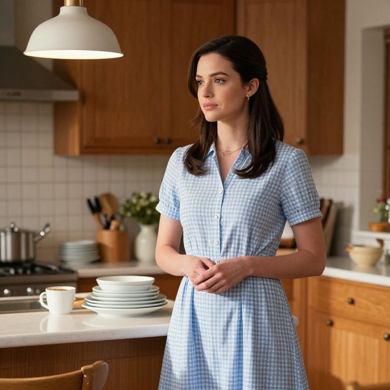 Actress in a light blue gingham dress stands poised in a warmly lit kitchen, her hands clasped together as she gazes off to the side, illuminated by a hanging pendant light above wooden cabinets and a sink counter with neatly arranged dishes.
