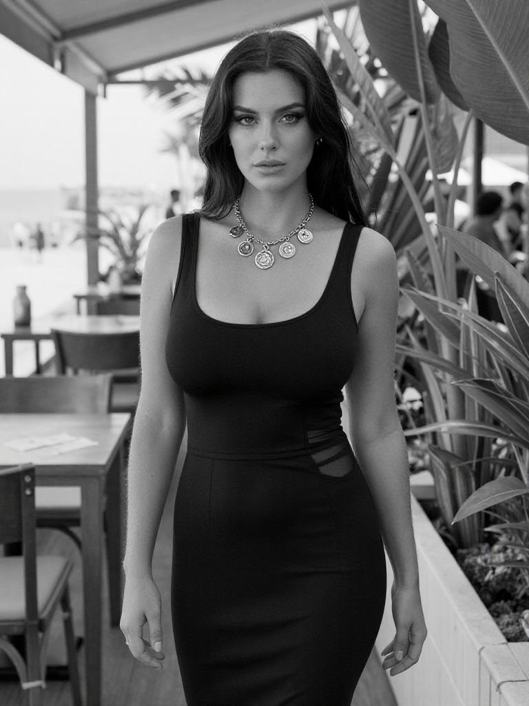 A stocky woman in a minimalist, sleeveless black dress with sheer paneling, accessorized with a statement silver necklace, stands at a seaside boardwalk café surrounded by tropical plants. Visual style: Ilford film stock. Sexy. Pretty face and beаutiful eyes. Big breasts