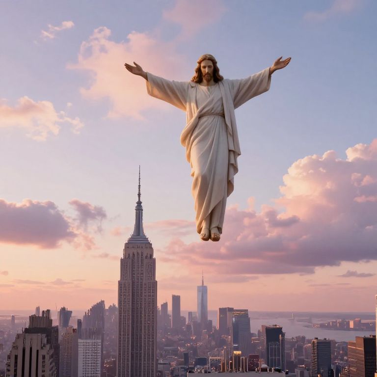 Soft Pastel majestic Jesus Christ second coming suspended over the sky over Empire states building in Manhattan at sunset, impacting image, apocalypse, hyper realistic,