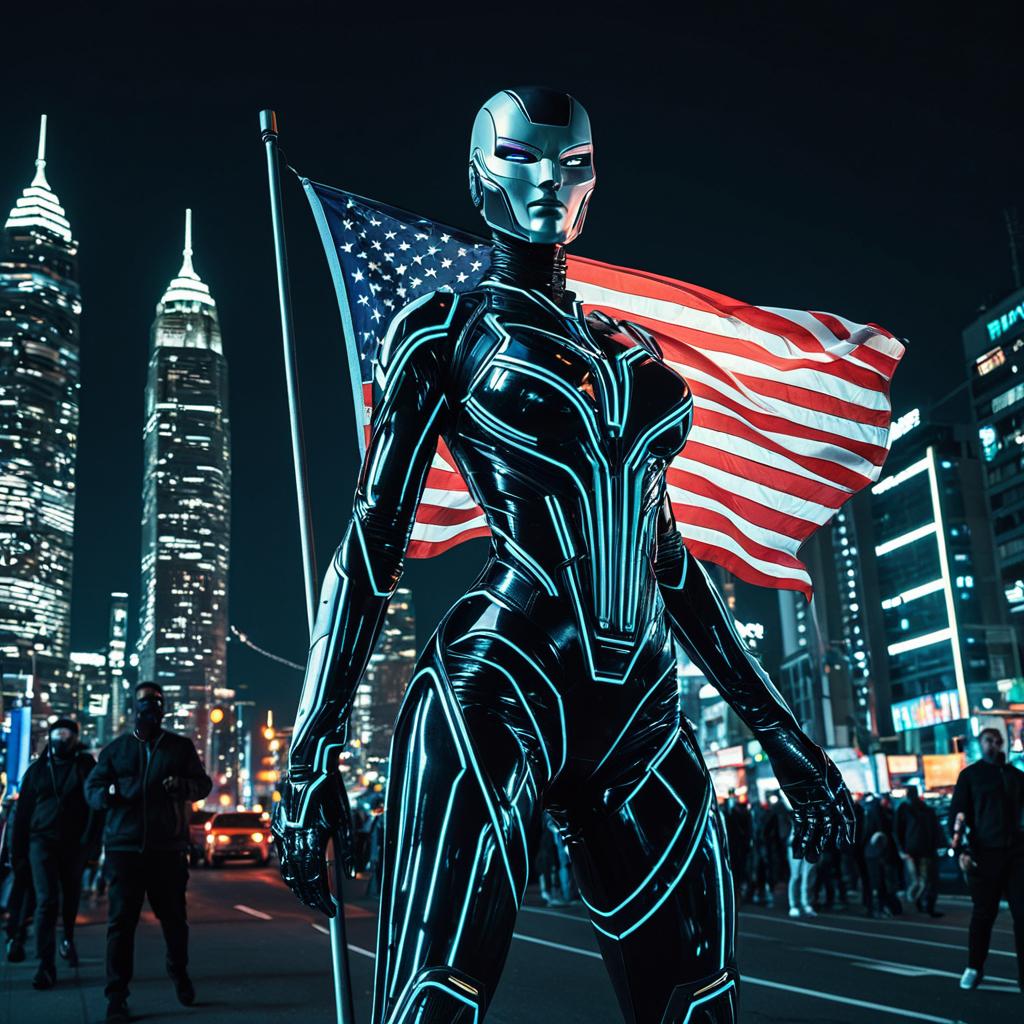 A solitary figure draped in a long coat stands in the ruins of a post-apocalyptic city, holding a flagpole with a waving United States flag beside a heavily damaged skyscraper enveloped in mist. The scene portrays a dramatic urban decay with debris and surrounding ruined buildings under a cloudy sky, rendered in a high-quality 3D psychological art style.