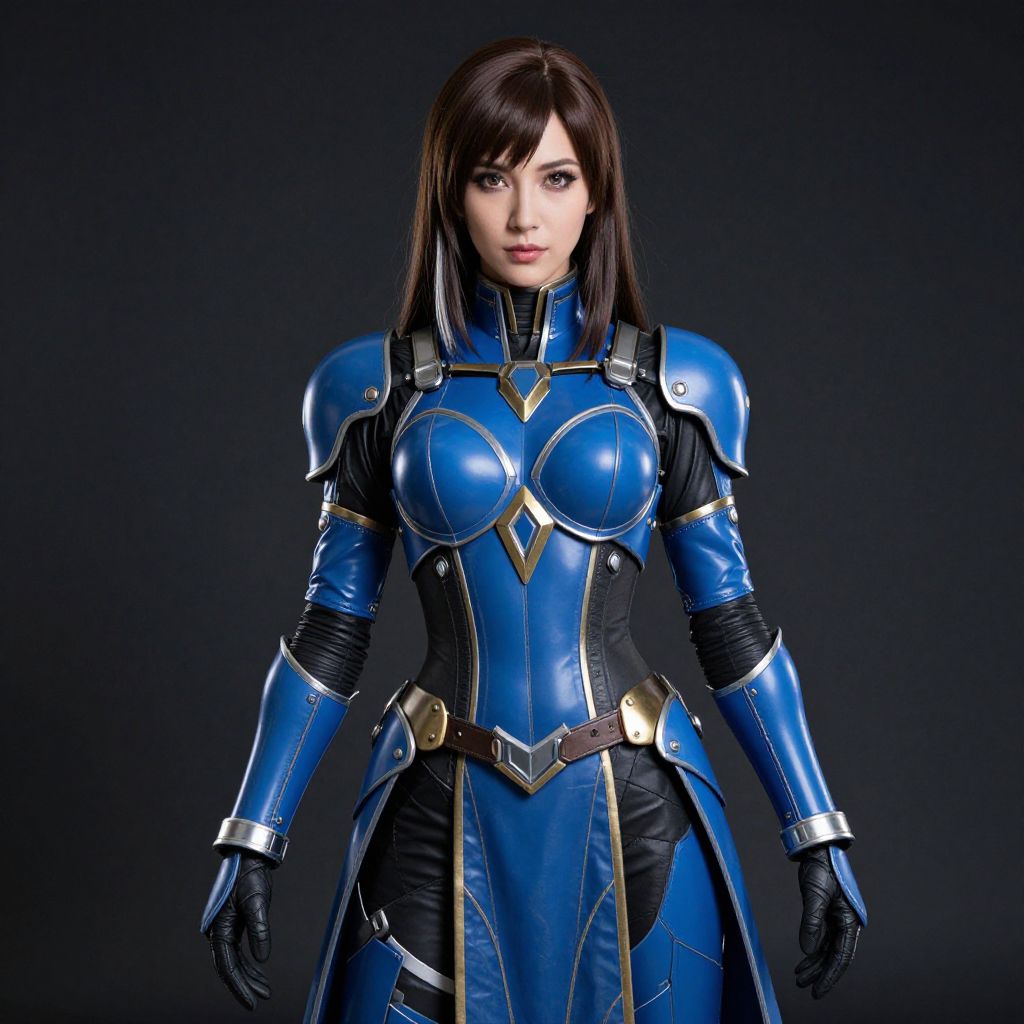 Photograph of a young Asian woman with fair skin and straight, black shoulder-length hair, wearing a shiny, blue and black armored suit. The armor has gold accents, covering her chest, shoulders, and arms, with a high collar and black gloves. Her breasts are moderately sized and the armor contours to her body, highlighting her curves. The background is a solid black, making her blue armor stand out. Her expression is neutral, with slightly parted lips and a focused gaze. The lighting emphasizes the metallic texture of the armor.