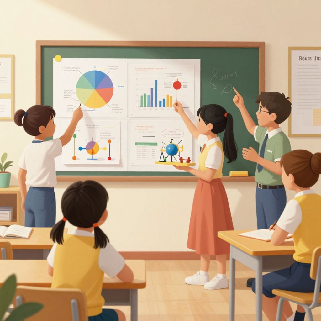 Schulprojekt scene showing a group of enthusiastic children presenting a science project with models and charts, bright and cheerful school environment, lively interactions, soft shadows and realistic textures, modern digital painting.