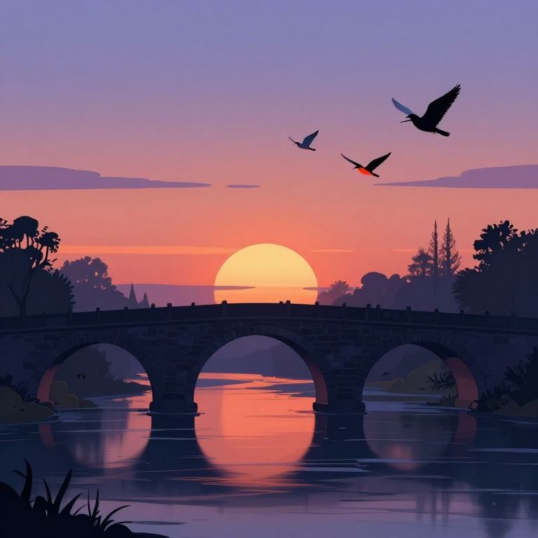 A serene digital illustration depicts a stone arch bridge spanning a tranquil river at sunset, its silhouette framed by vibrant twilight hues and adorned with birds bearing dual-colored wings, symbolizing the transition between night and day.