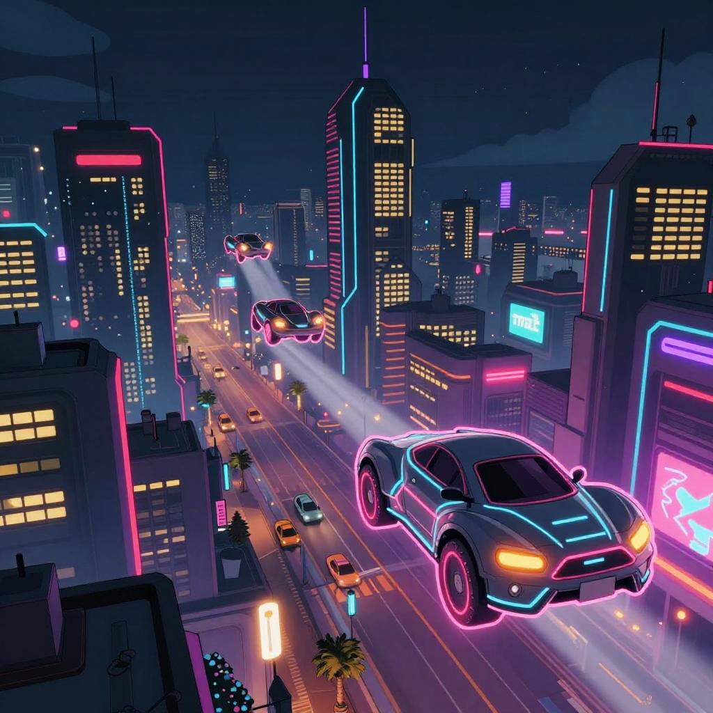 Digital art depicting a neon-lit, futuristic cityscape at night. Two high-performance, glowing neon-blue and pink cars drive on a brightly illuminated, multi-lane street. Surrounding skyscrapers feature vibrant neon signs in pink, blue, and purple. The background showcases a dense cluster of lit-up buildings against a dark, starry sky. Traffic lights and streetlights are also neon, adding to the vibrant, cyberpunk aesthetic. The cars' headlights and outlines are vividly illuminated, contrasting with the dark buildings and the glowing city lights. The overall style is highly stylized and futuristic, evoking a sense of high-tech urban nightlife.