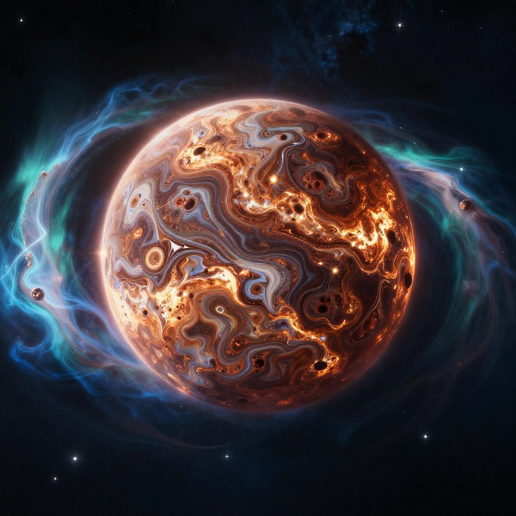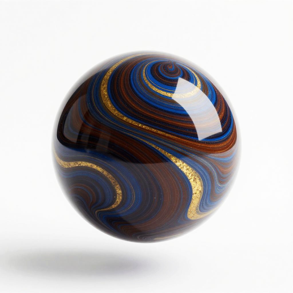 This is a photograph of a glossy, marbled orb with intricate swirls of dark brown, rich blue, and gold. The orb has a shiny, reflective surface that catches light, creating a sense of depth and movement. It's floating against a clean, white background with a subtle shadow beneath, giving it a floating appearance. The image has a modern, almost abstract art style.