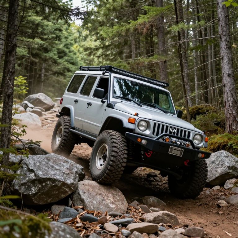 Willys Wagon navigating a rugged forest trail in Bethel, Maine, showcasing its robust design and elevated stance as it maneuvers between towering trees and over scattered rocks, demonstrating both the challenge and triumph of off-road exploration.