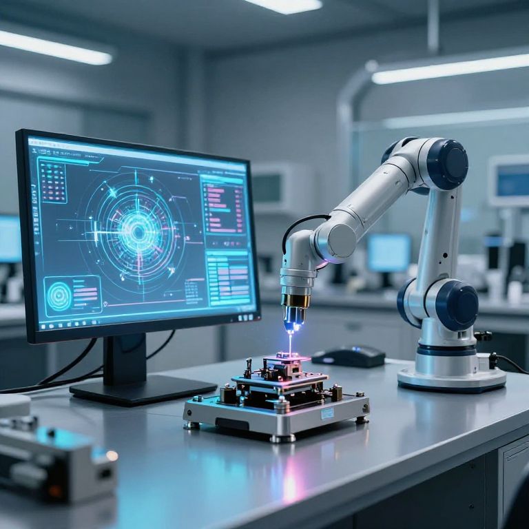 Photograph of a high-tech laboratory with a blue and white color scheme. On a metallic table, a computer monitor displays a digital blue and white radar interface. Next to it is a sophisticated robotic microscope with a shining blue laser pointer focused on a small circuit board. The background shows blurred lab equipment and cabinets under bright fluorescent lights, creating a modern, sterile, and scientific atmosphere. The image conveys precision, advanced technology, and meticulous research.