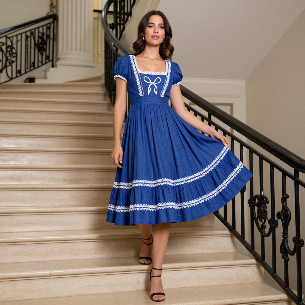 Photograph of a young woman with wavy dark brown hair, wearing a blue, short-sleeved, knee-length dress with white lace trim and a bow at the chest. She stands on a grand, beige marble staircase, holding the hem of her dress with her right hand. She wears black strappy sandals. The staircase has black wrought iron railings and white columns in the background. Her expression is neutral, and the lighting is bright, highlighting the textures of the dress and marble steps.
