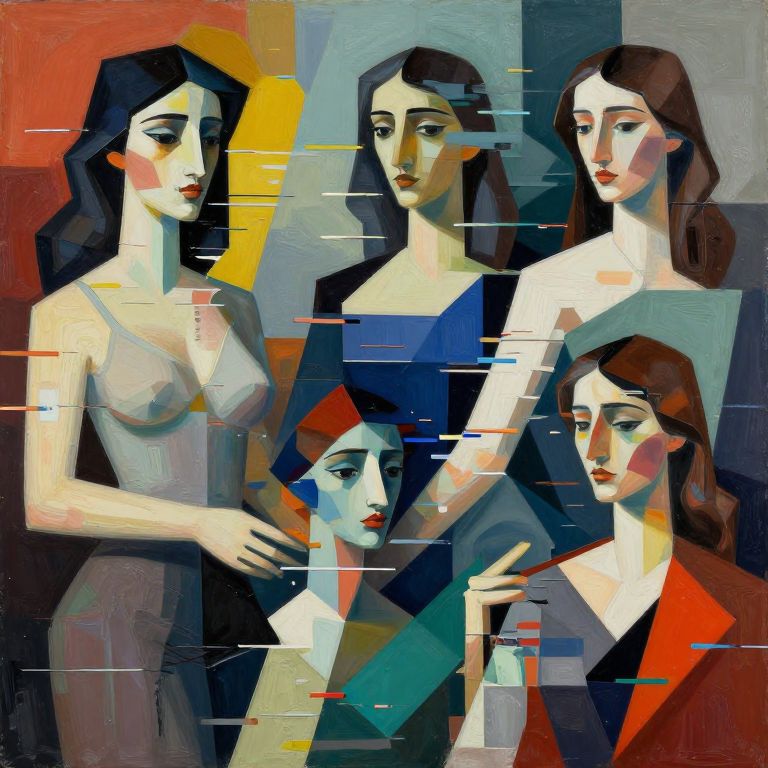 This digital painting in a Cubist style features four women with elongated faces and angular, geometric shapes. They have pale skin, dark hair, and red lips. The woman on the left wears a sheer, white dress revealing her small breasts, while the others wear solid-colored dresses in blue and red. Their expressions are serious. The background is abstract with bold, intersecting stripes in red, yellow, blue, and white. The women are positioned close together, with the central figure slightly in front. The overall composition is layered and fragmented, emphasizing modernist aesthetics and emotional intimacy.