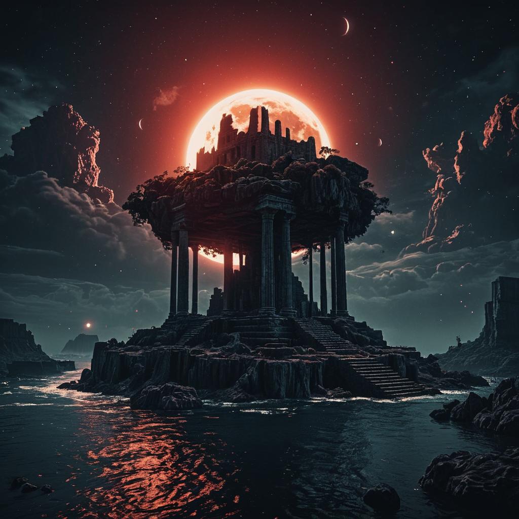 A detailed image of an ancient ruin on a small, cracked asteroid floating on an asteroid in space, partially collapsed stone arches and pillars, deep vacuum with stars and fading supernova, ghostly phosphorescent glow, cinematic atmosphere, vivid and intricate details