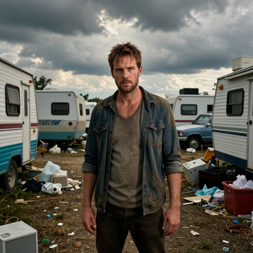 Photograph of a rugged, bearded man with tousled brown hair standing in a cluttered, outdoor RV park. He wears a dirty, dark gray t-shirt under a worn, blue denim jacket, and dark pants. The background features several white RVs with blue and red stripes parked on a dirt lot, scattered with trash and debris. The sky above is cloudy with patches of sunlight breaking through, casting a dramatic light on the scene. The man's expression is serious and intense, adding to the gritty, hard-living atmosphere of the image.
