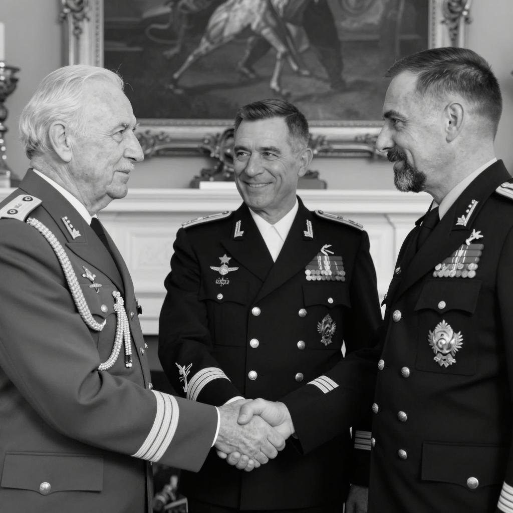 Three men in a military setting. One in dark coat and hat, facing left. Middle man in brown coat with fur collar, smiling. Right man in blue military uniform, decorated with medals, serious expression. Background: industrial interior.