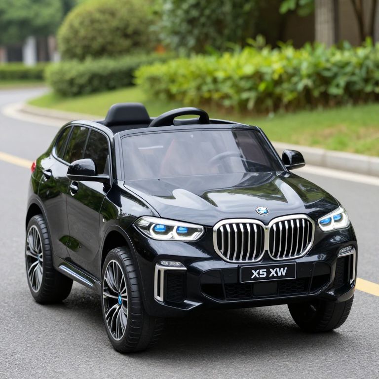 Black BMW X5-inspired electric ride-on car designed for kids, featuring a sleek 12V build with detailed front grille, LED headlights, and a license plate reading \"X5 XW,\" parked on a paved road surrounded by greenery.