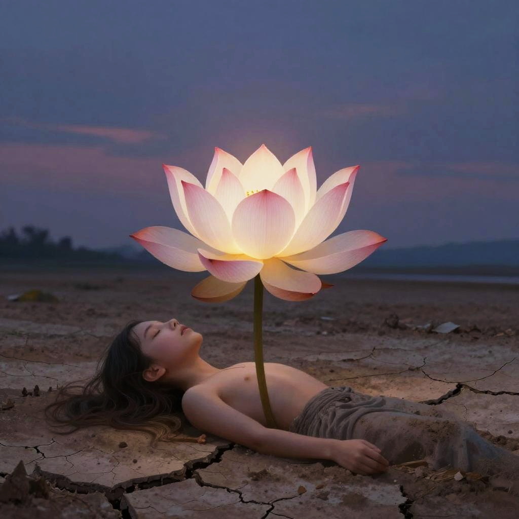 Enlightenment through suffering illustrated by a lotus blooming from cracked, barren earth under a twilight sky, soft glowing hues, spiritual symbolism, painterly style.
