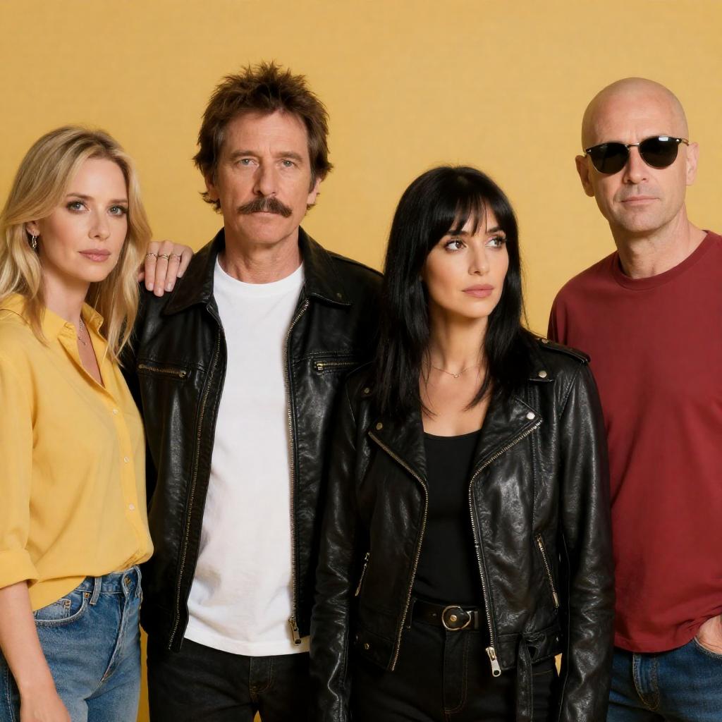 Photograph of four people standing close together against a yellow, ured background. Left: woman with blonde hair, yellow shirt, arm around middle-aged man with black leather jacket, white shirt, mustache. Center: woman with black hair, leather jacket, looking to the right. Right: bald man with sunglasses, red shirt, looking forward. Middle-aged man has arm around woman with black hair. All have casual, slightly edgy styles. Yellow background has ured pattern.