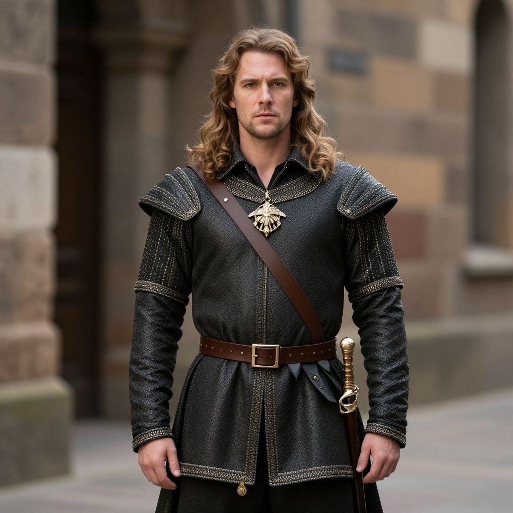 Photograph of a tall, handsome man with long, wavy brown hair, wearing a black, medieval-style, armored tunic with a brown belt