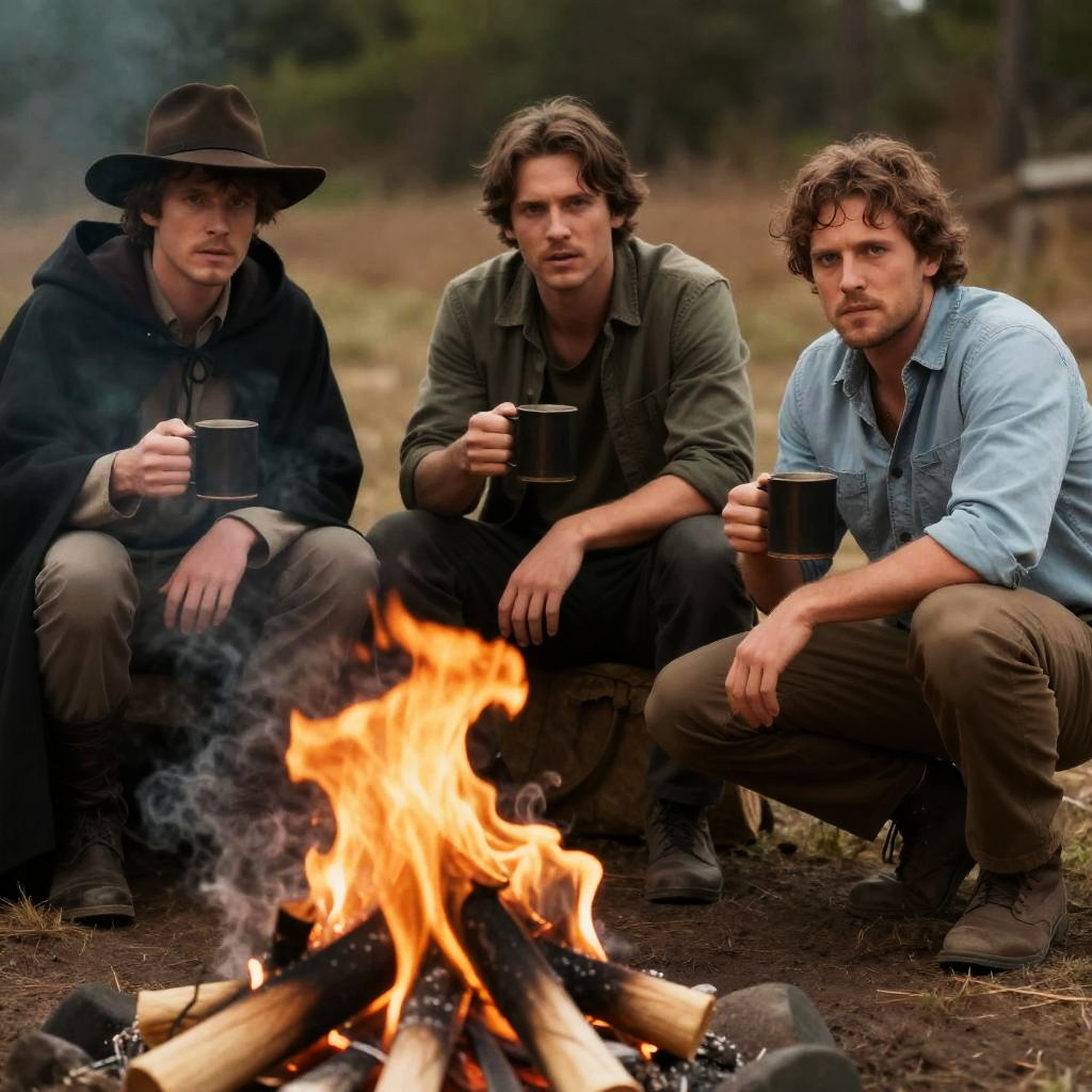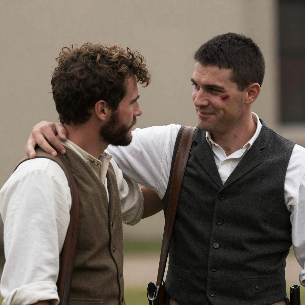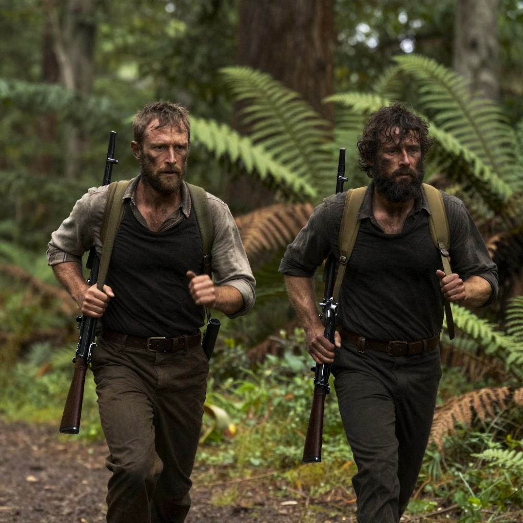 A man with messy brown hair, wearing a blood-stained brown shirt and green pants, runs with a joyful expression. A second man with blood on his shirt and dark pants chases him from behind. Background includes a wooden house, wire mesh, and a tree. Grass covers the ground.