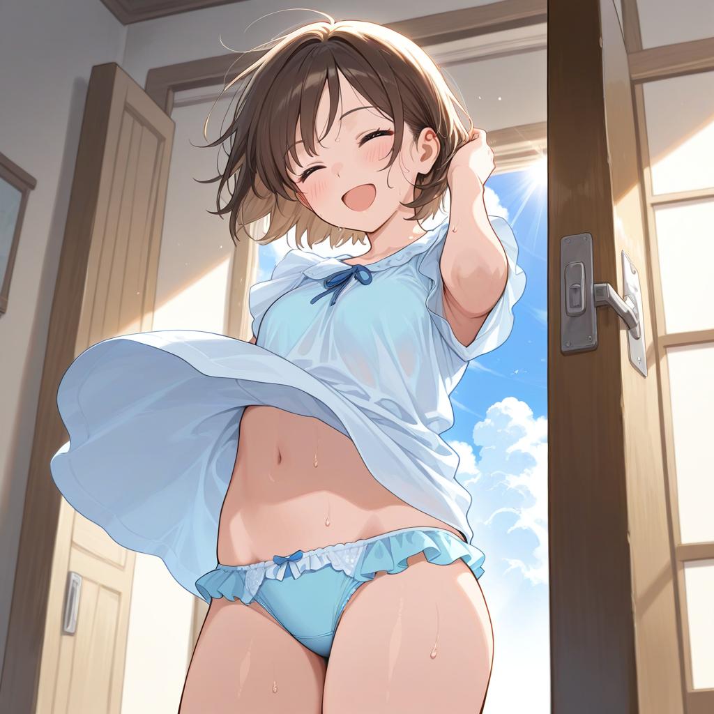 Absurdres, highres, best quality, 1girl, short hair, wind, clothes lift, frilled panties, closed eyes, open mouth, indoors, sunlight, open door, sweat, sweatdrop, cloud
