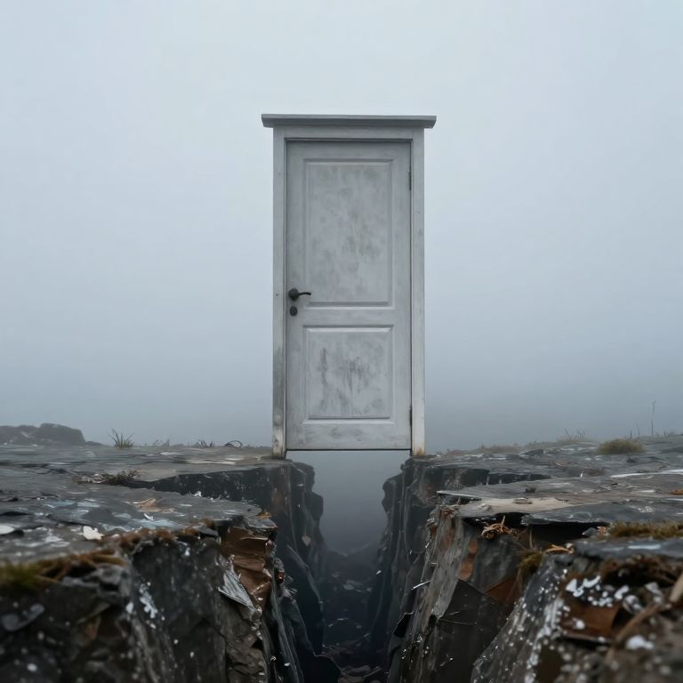 Photograph of a small, weathered, white door standing upright in the middle of a deep, narrow, rocky chasm. The door has a simple design with a black handle on the right side. The chasm's walls are jagged and wet, reflecting the door, with patches of grass at the top. The background is a foggy, pale blue sky, creating a mysterious, surreal atmosphere. The door's surface is slightly stained and worn, adding to the overall eerie and isolated feel of the scene.