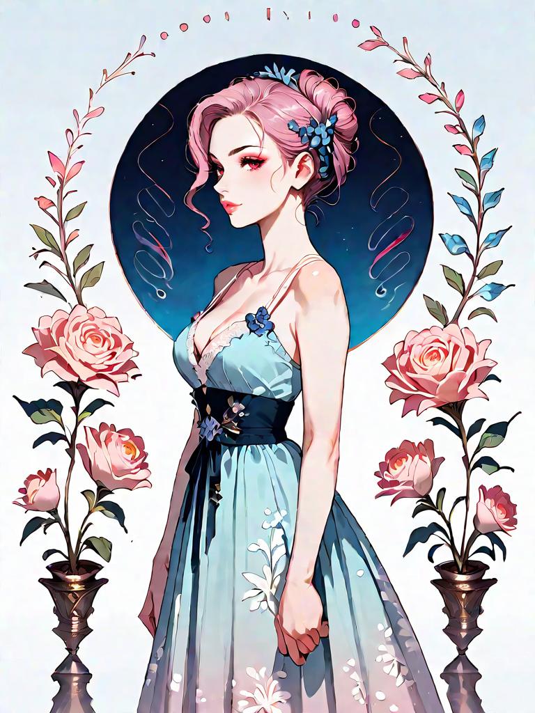 Illustration of a fantasy woman with pink hair wearing a flowing blue-green off-shoulder dress with intricate lace and ruffled sleeves. She stands amidst blooming flowers under an arched decorative frame, exuding a romantic and bohemian atmosphere.