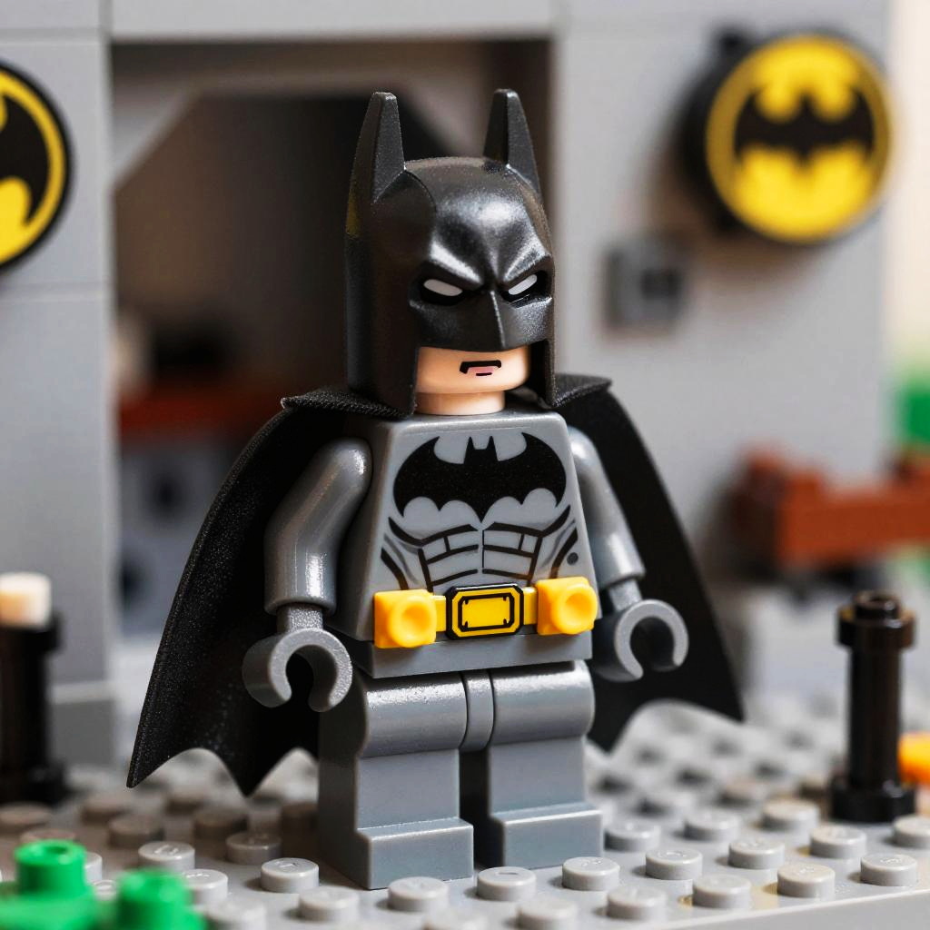 Realistic photo.Batman as a Lego figurine, highly detailed, iconic costume and accessories, in the style of official Lego design, vibrant colors, realistic lighting, close-up view, themed scene related to Gotham City realistic photo