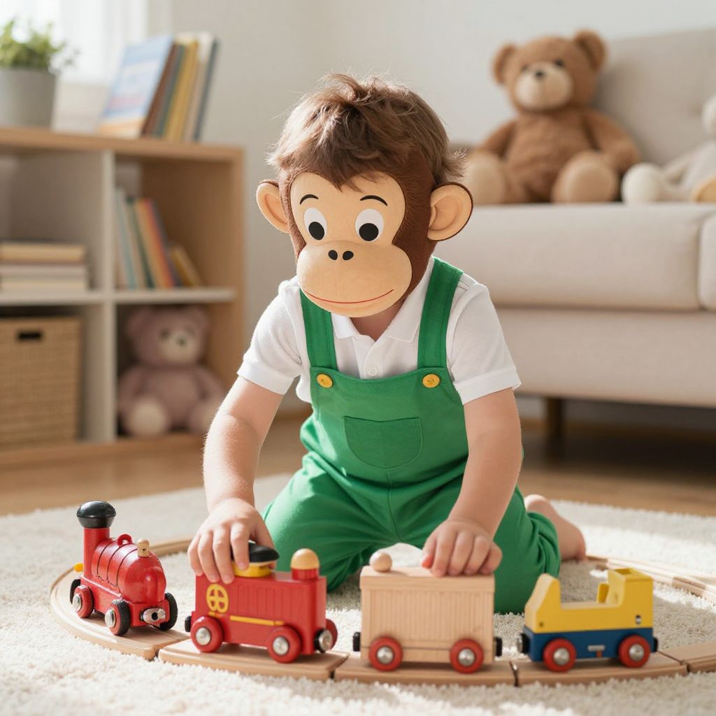 A Curious George costume worn by a toddler, with a monkey face mask and green overalls, playing with a wooden train set in a sunlit living room, surrounded by books and stuffed animals.