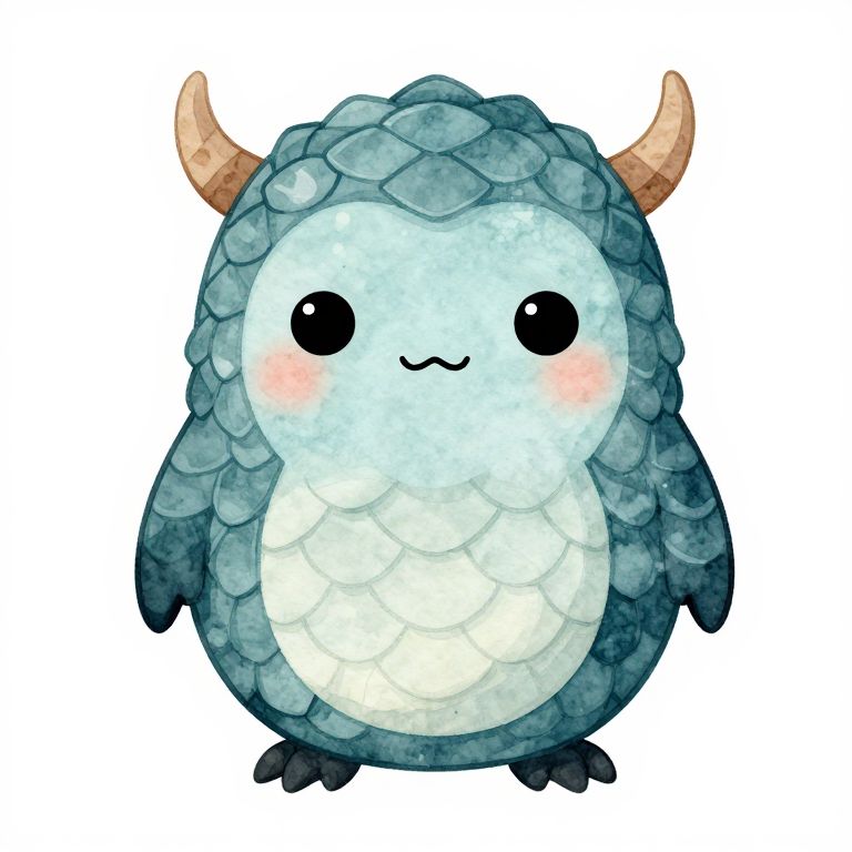 A digital watercolor drawing of an adorable, round, chibi-style creature resembling an owl with small, curved, beige horns. The creature has a light blue, textured, scaly body with darker blue scales on the upper half and white scales on the lower half. It has large, black, round eyes, a tiny, smiling mouth, and pink blush on its cheeks. The background is plain white, making the creature the focal point. The overall style is cute and whimsical, with soft, pastel colors and a gentle, playful aesthetic.
