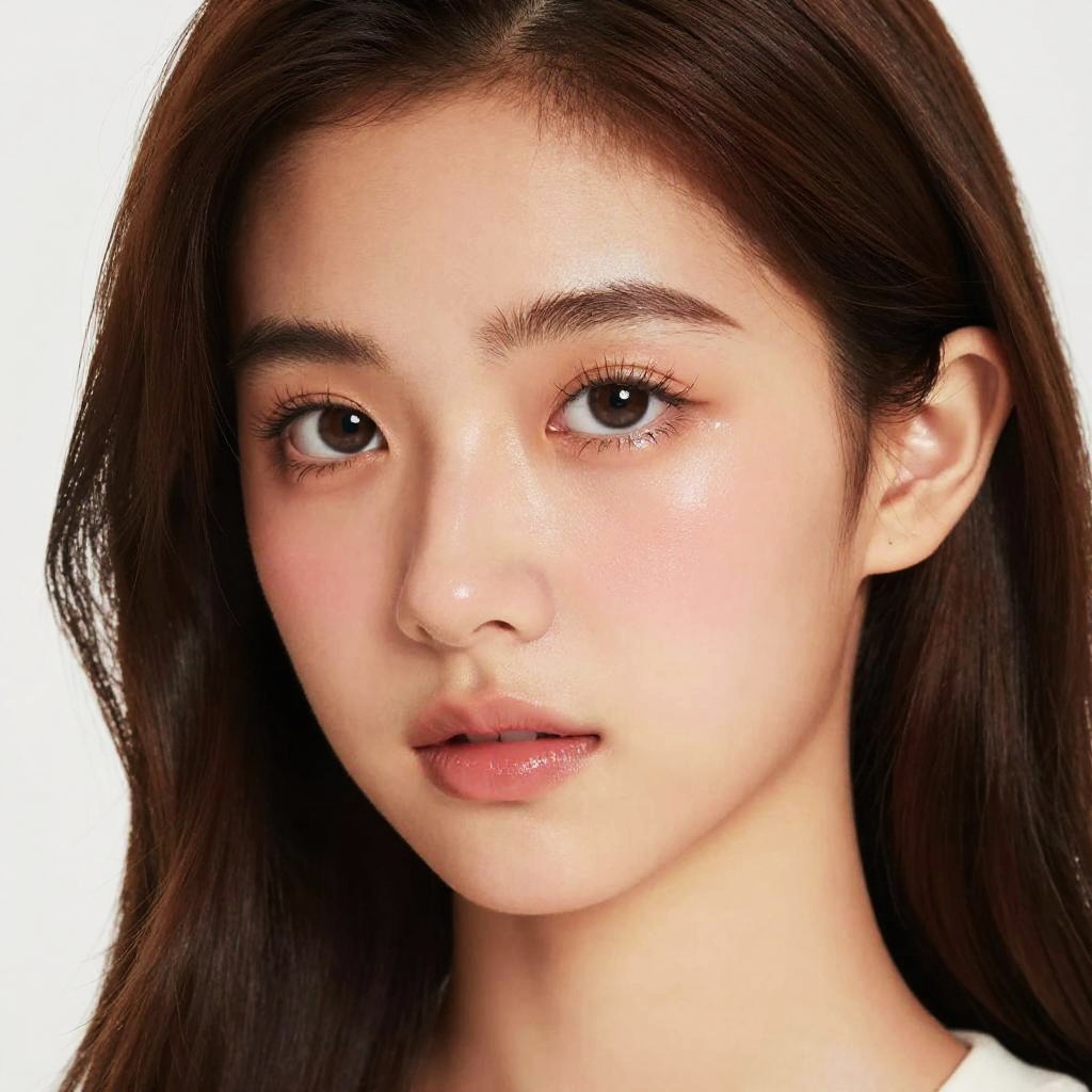 Close-up photograph of an Asian woman with fair skin, black hair, and subtle smile, white background, natural makeup, and soft lighting.