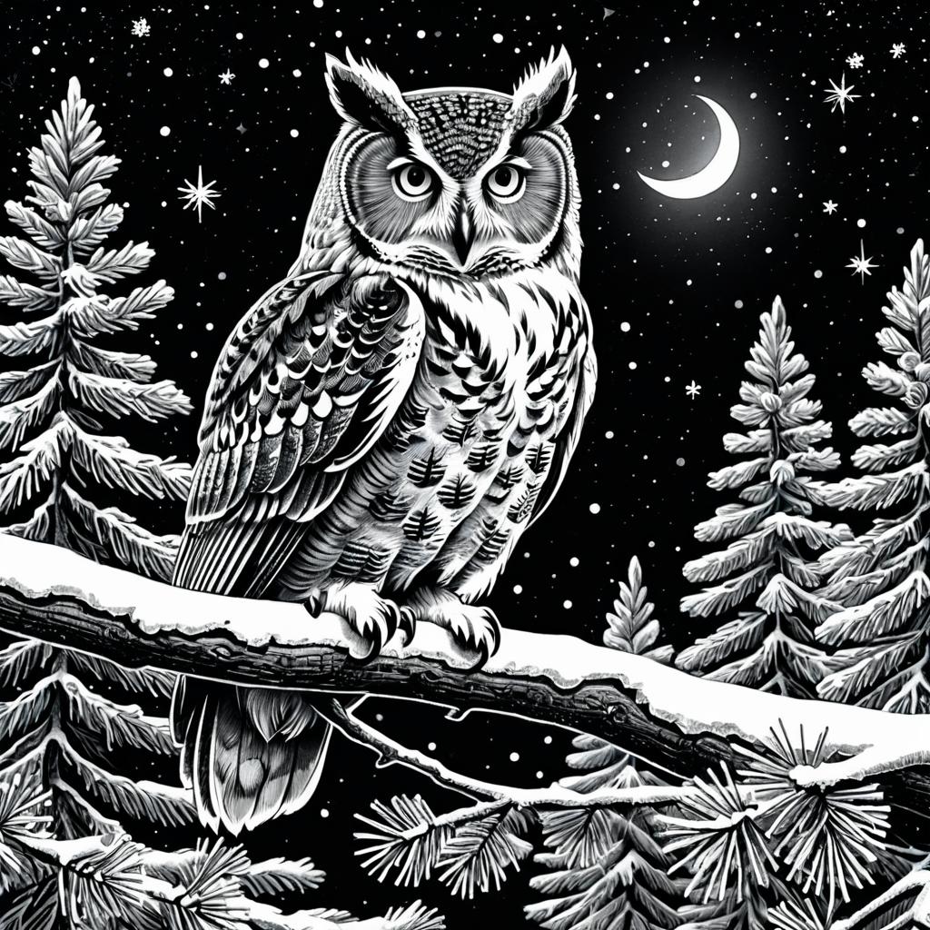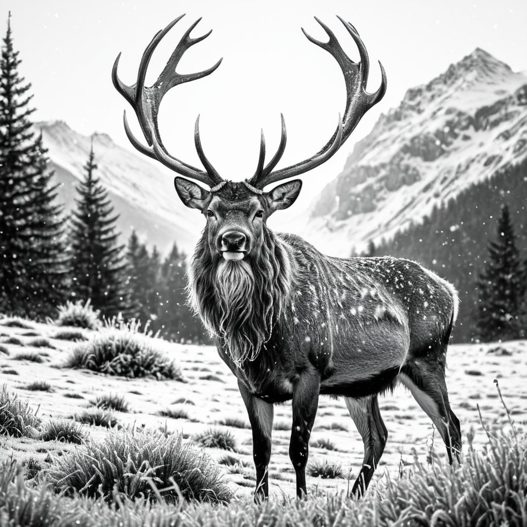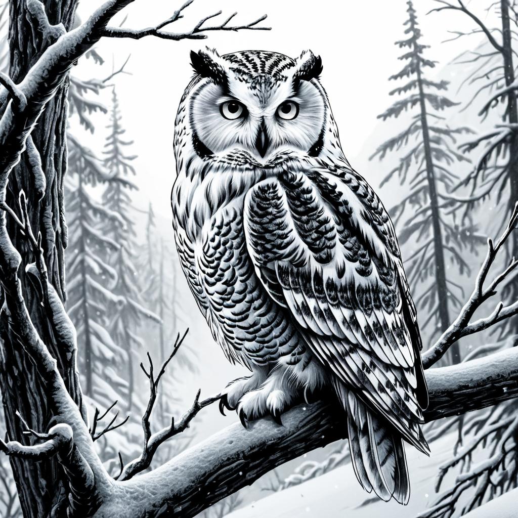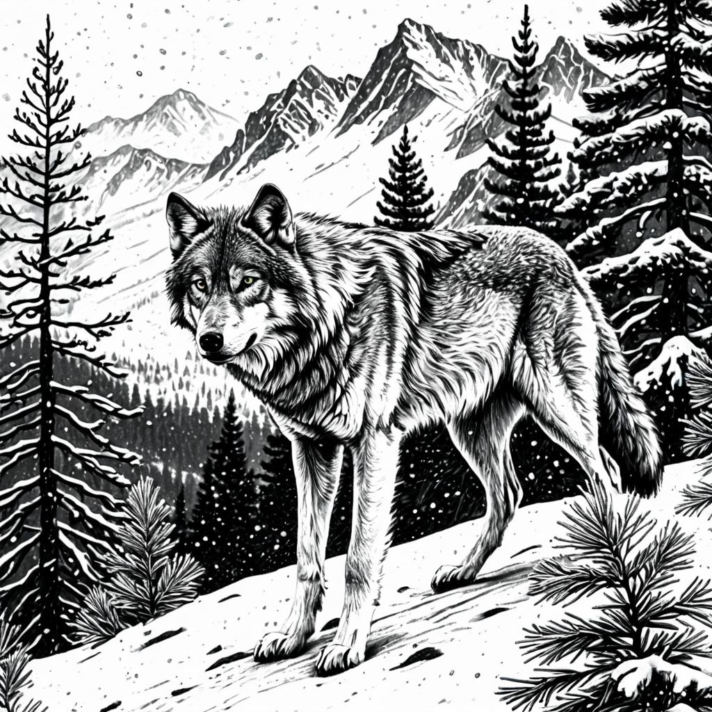 Hand-drawn grayscale winter-themed coloring page for adults, featuring majestic evergreen tree adorned with icicles in frost-covered mountain ridge at dawn, with detailed stipple shading combined with fine hatching on a white background, ultra high resolution, clean smooth lines, octane render, 8k.