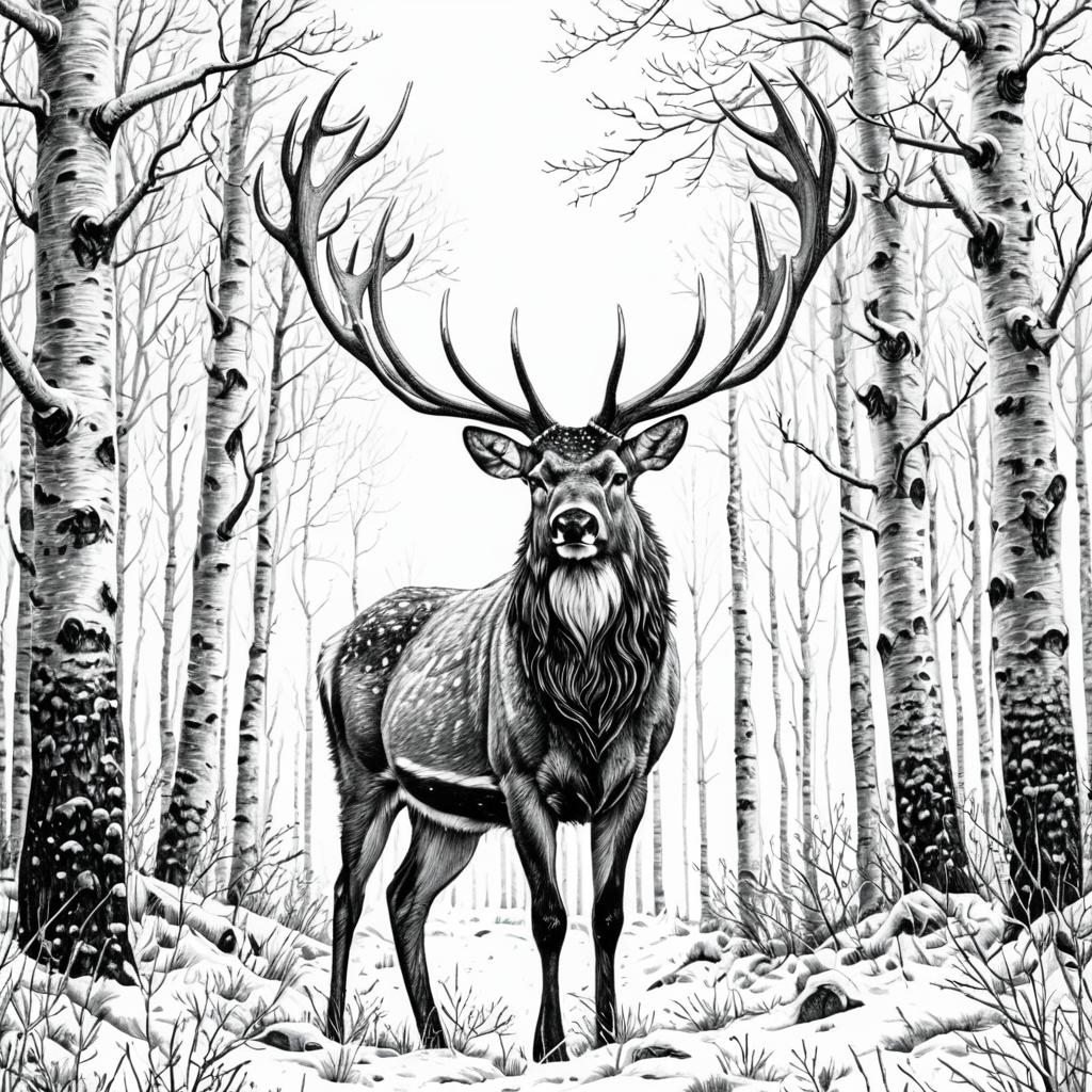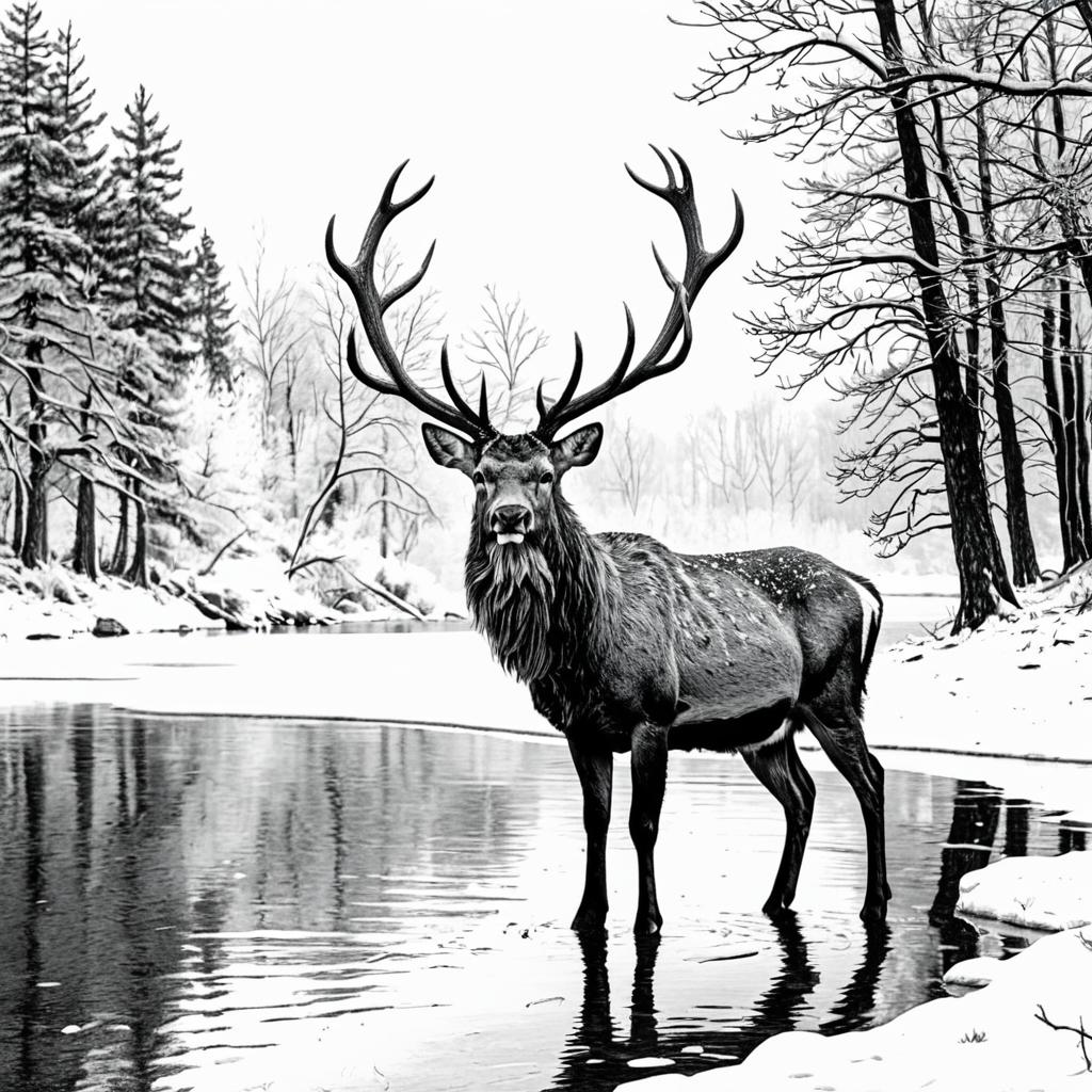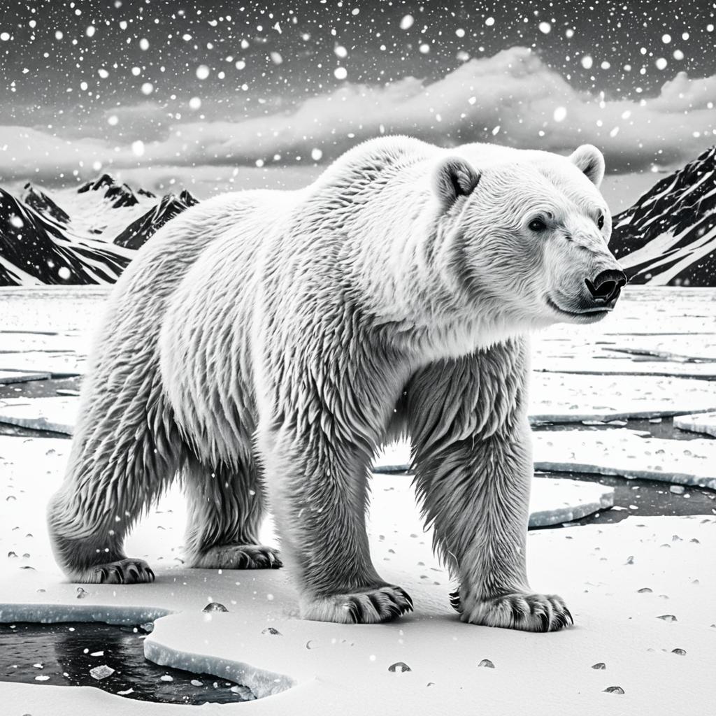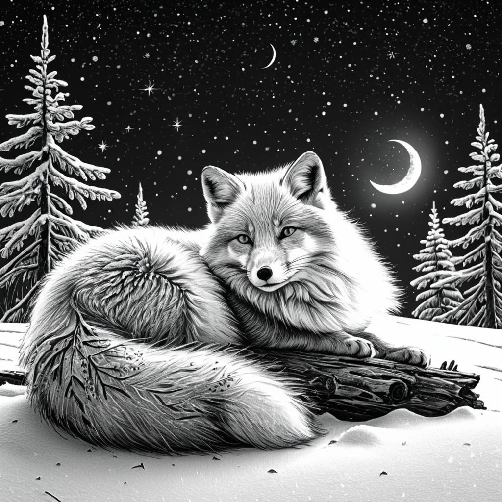 Hand-drawn grayscale winter-themed coloring page for adults, featuring majestic evergreen tree adorned with icicles in frost-covered mountain ridge at dawn, with detailed stipple shading combined with fine hatching on a white background, ultra high resolution, clean smooth lines, octane render, 8k.