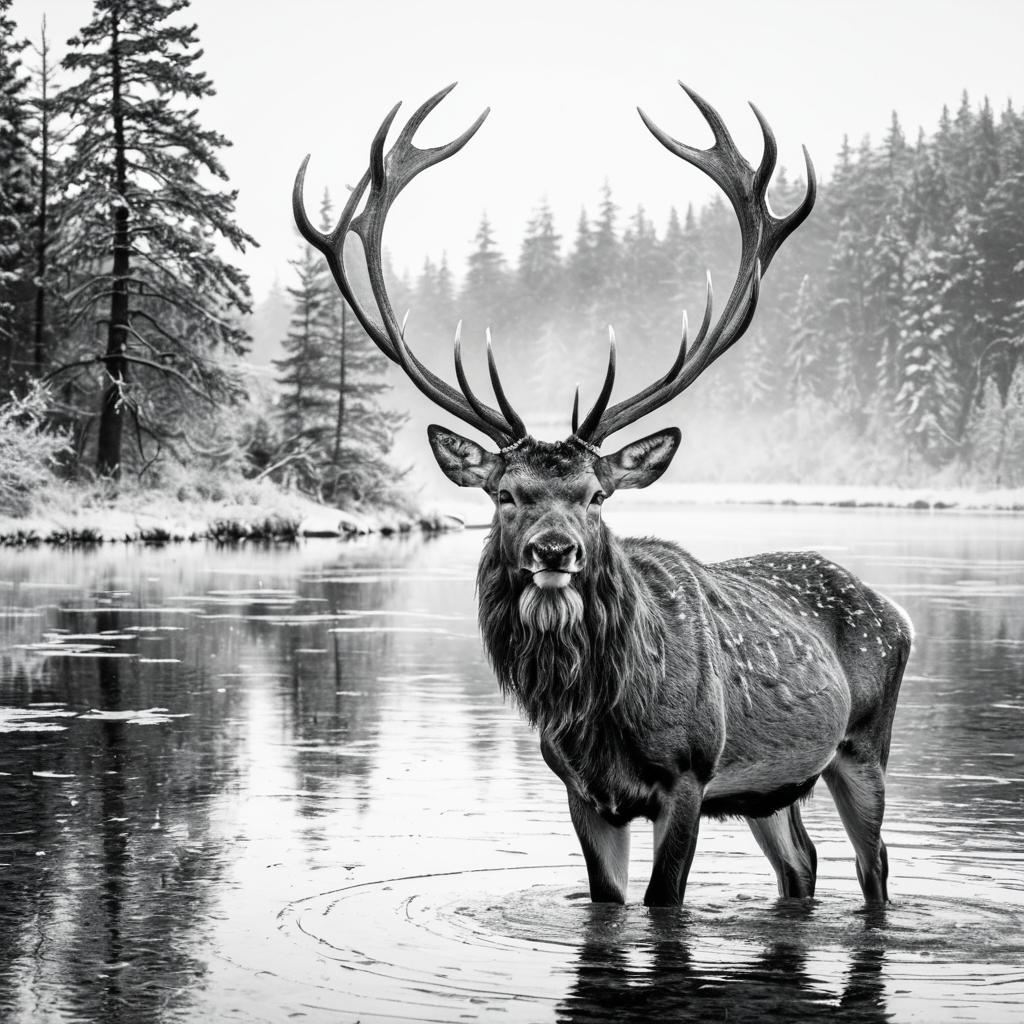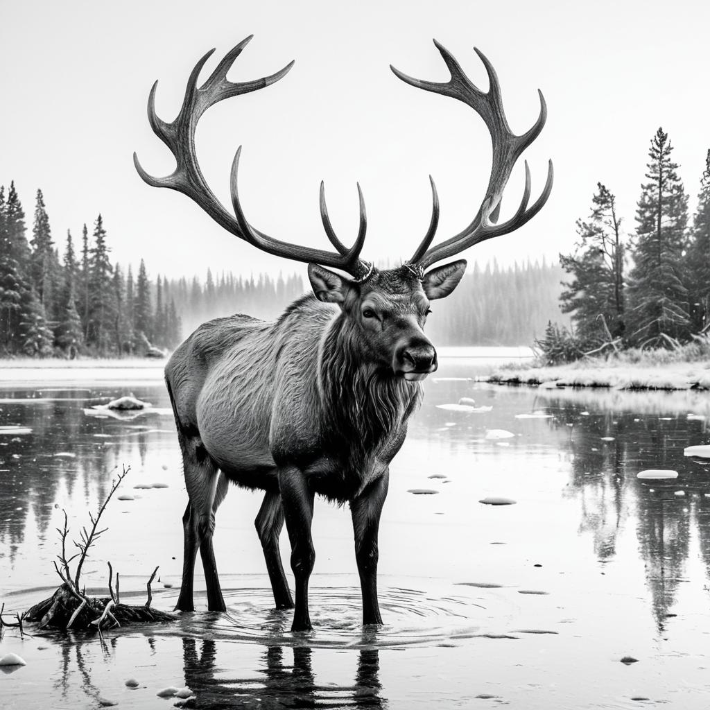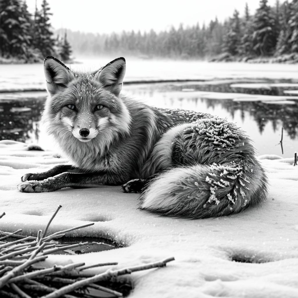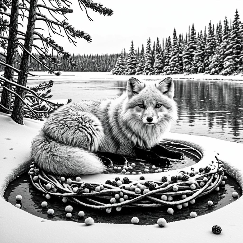 Hand-drawn grayscale winter-themed coloring page for adults, featuring majestic evergreen tree adorned with icicles in frost-covered mountain ridge at dawn, with detailed stipple shading combined with fine hatching on a white background, ultra high resolution, clean smooth lines, octane render, 8k.