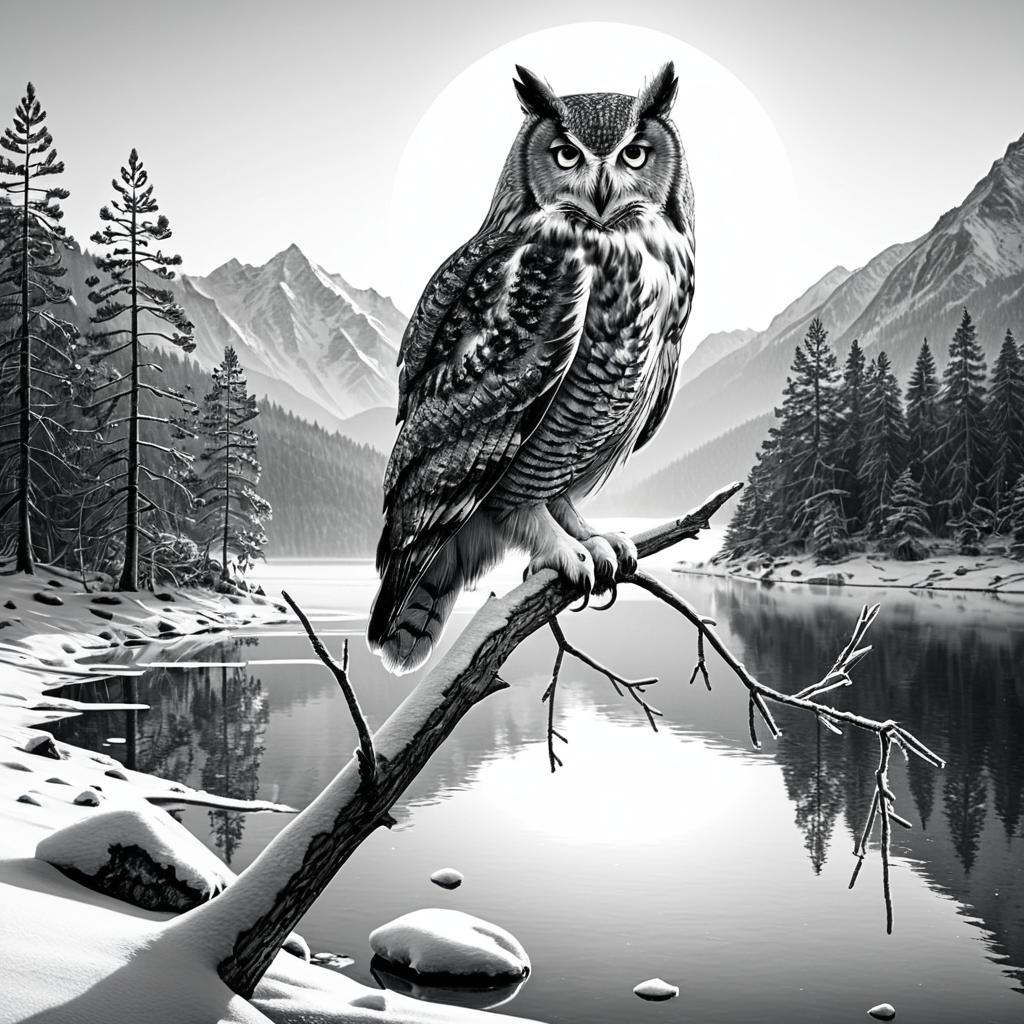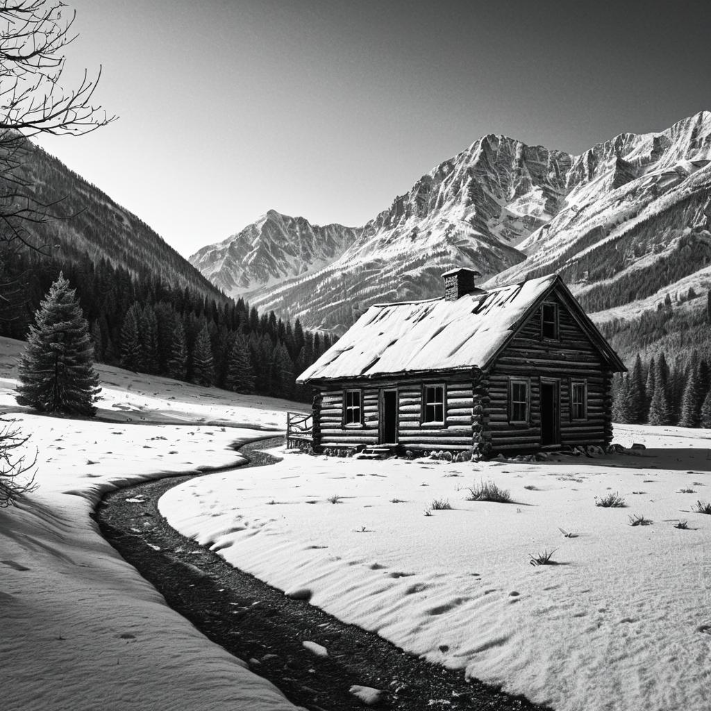 Hand-drawn grayscale illustration of a winter mountain scene featuring a large evergreen tree covered in snow and icicles. The detailed image depicts a frost-covered mountain ridge in the background at dawn. The artwork uses stipple shading and fine hatching techniques on a white background, emphasizing texture and depth in ultra high resolution.
