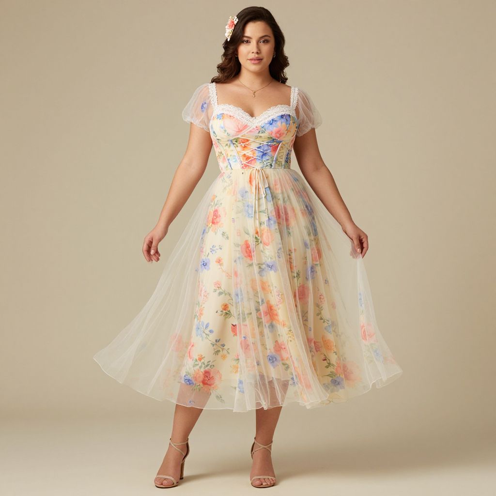 Full body shot, curvy woman, corset-inspired floral dress, fitted bodice, sweetheart neckline, delicate lace trim, vibrant floral print, flowing A-line skirt, lightweight chiffon fabric, cinched waist, adjustable lace-up back, short puff sleeves, soft tulle overlay, knee-length hem, strappy heeled sandals, pastel color palette, elegant accessories, dainty gold necklace, matching floral hairpin, natural makeup, soft waves hairstyle Sexy. Pretty face and beаutiful eyes. Big breasts