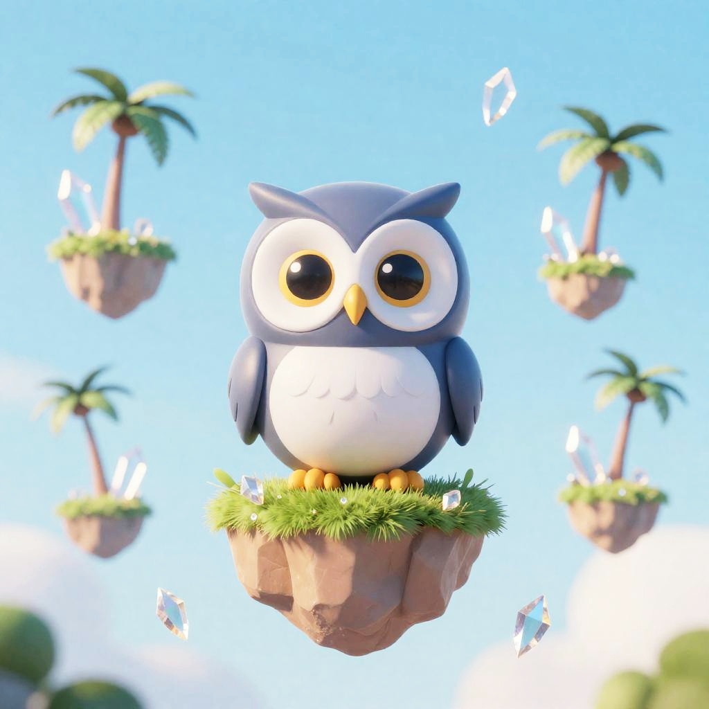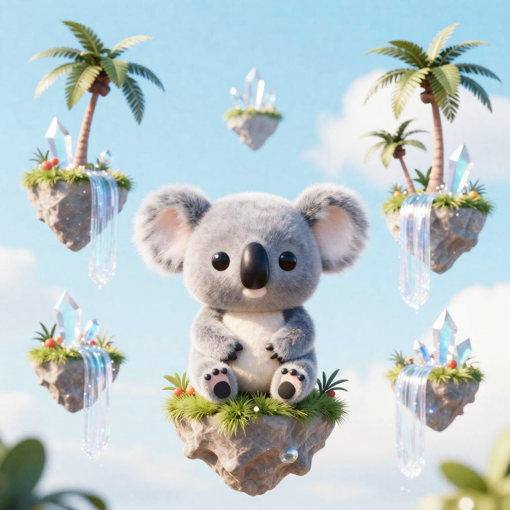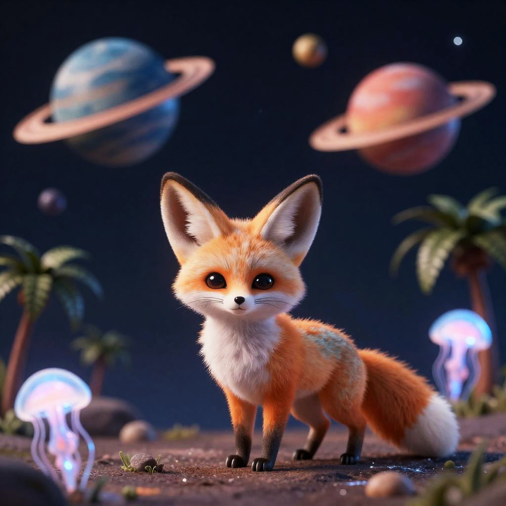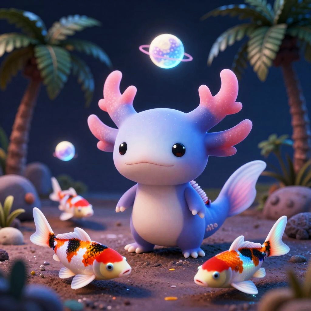 Alien cute hedgehog with aurora archipelago orbiting paper lanterns, palm trees