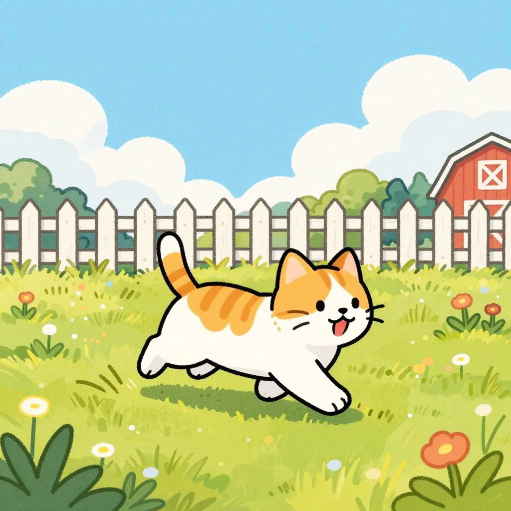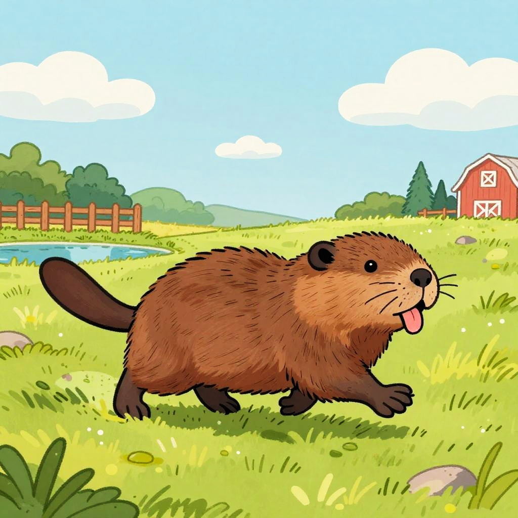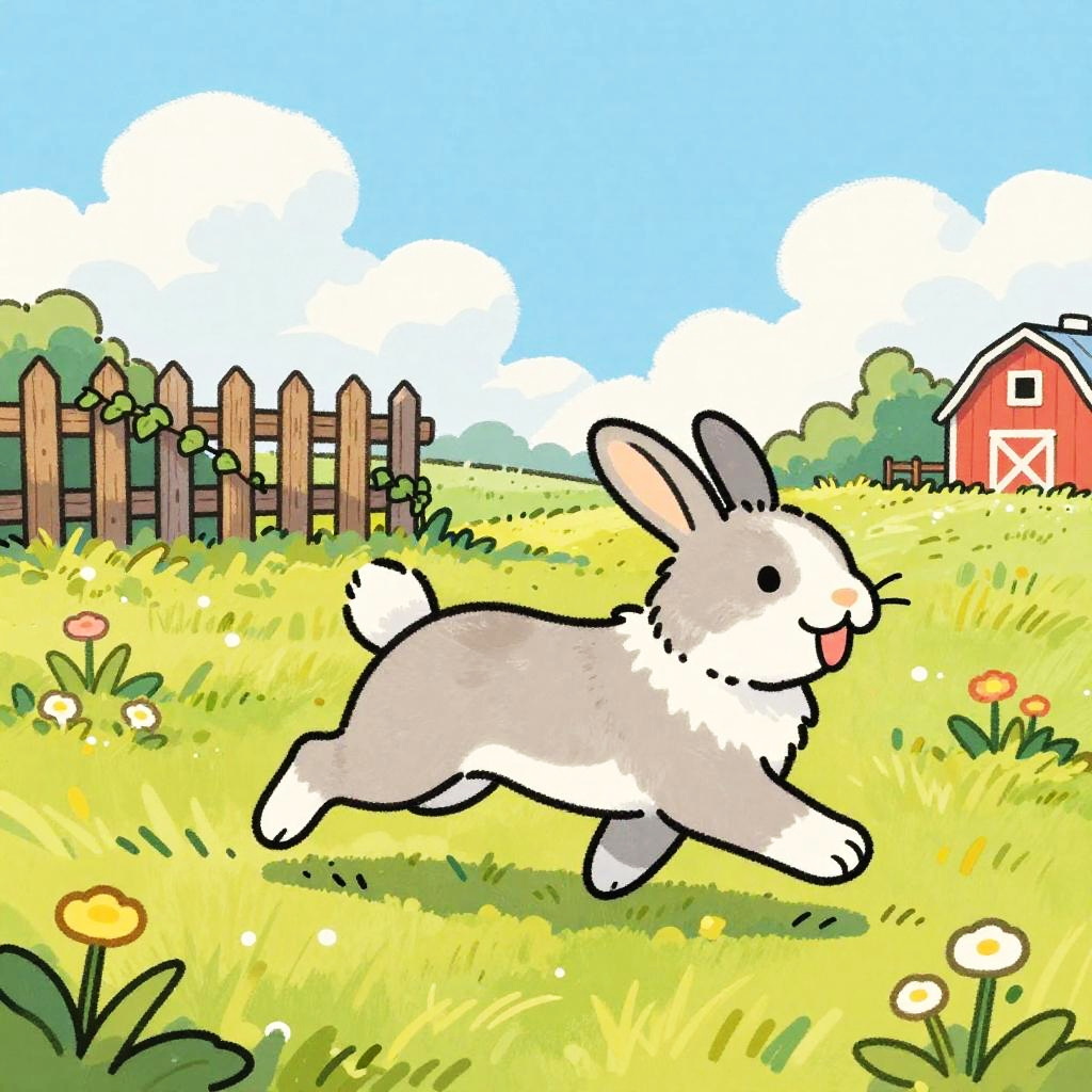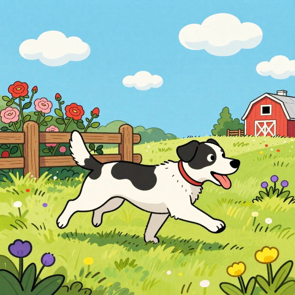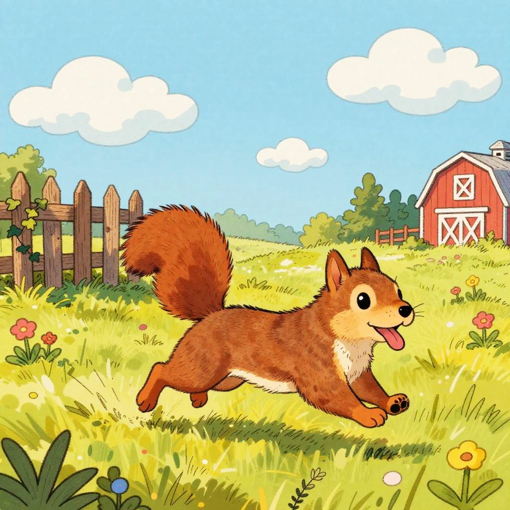 A colorful hand-drawn cartoon of a pony with soft chestnut brown fur and a white mane running happily through a sunny grassy field. The background features a white wooden fence, wildflowers, a red barn, and a pastel blue sky with scattered fluffy clouds. The scene evokes a playful rural atmosphere with vibrant colors and a sketchy art style.