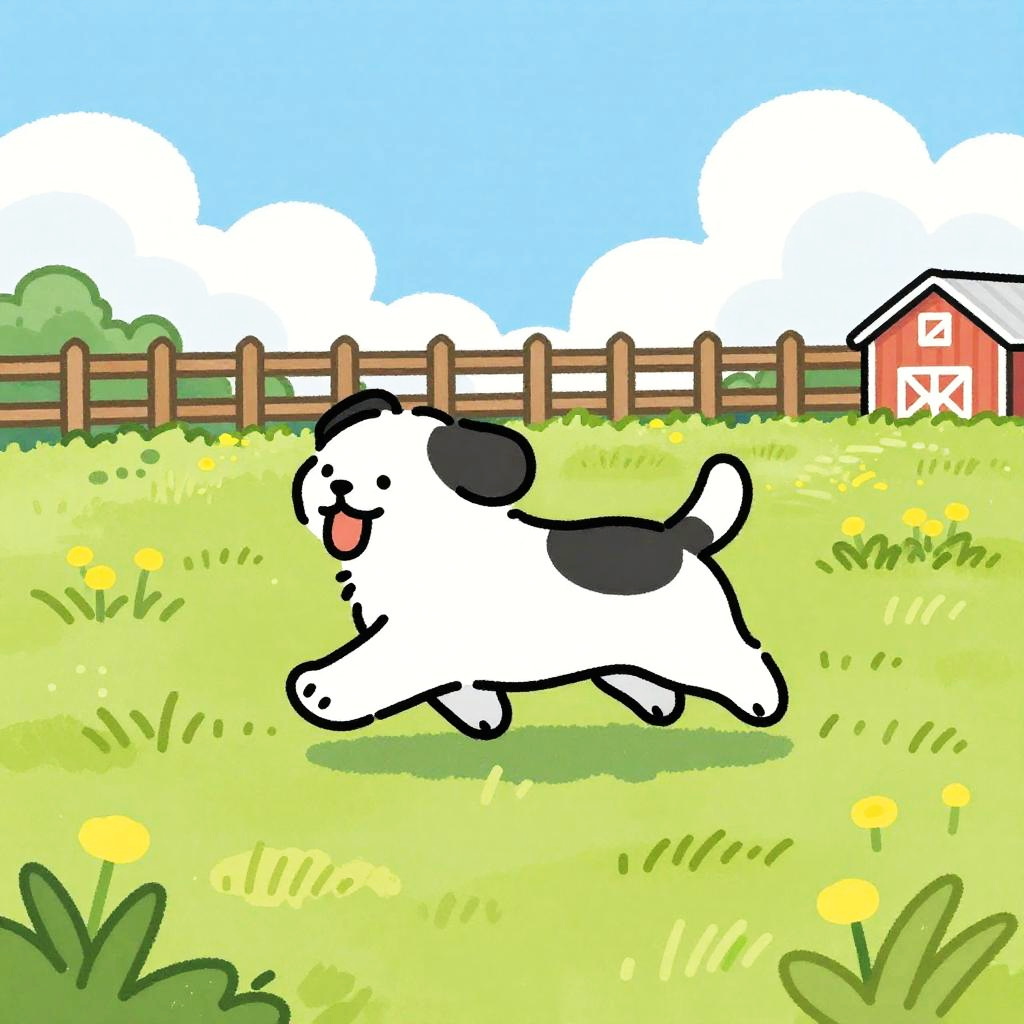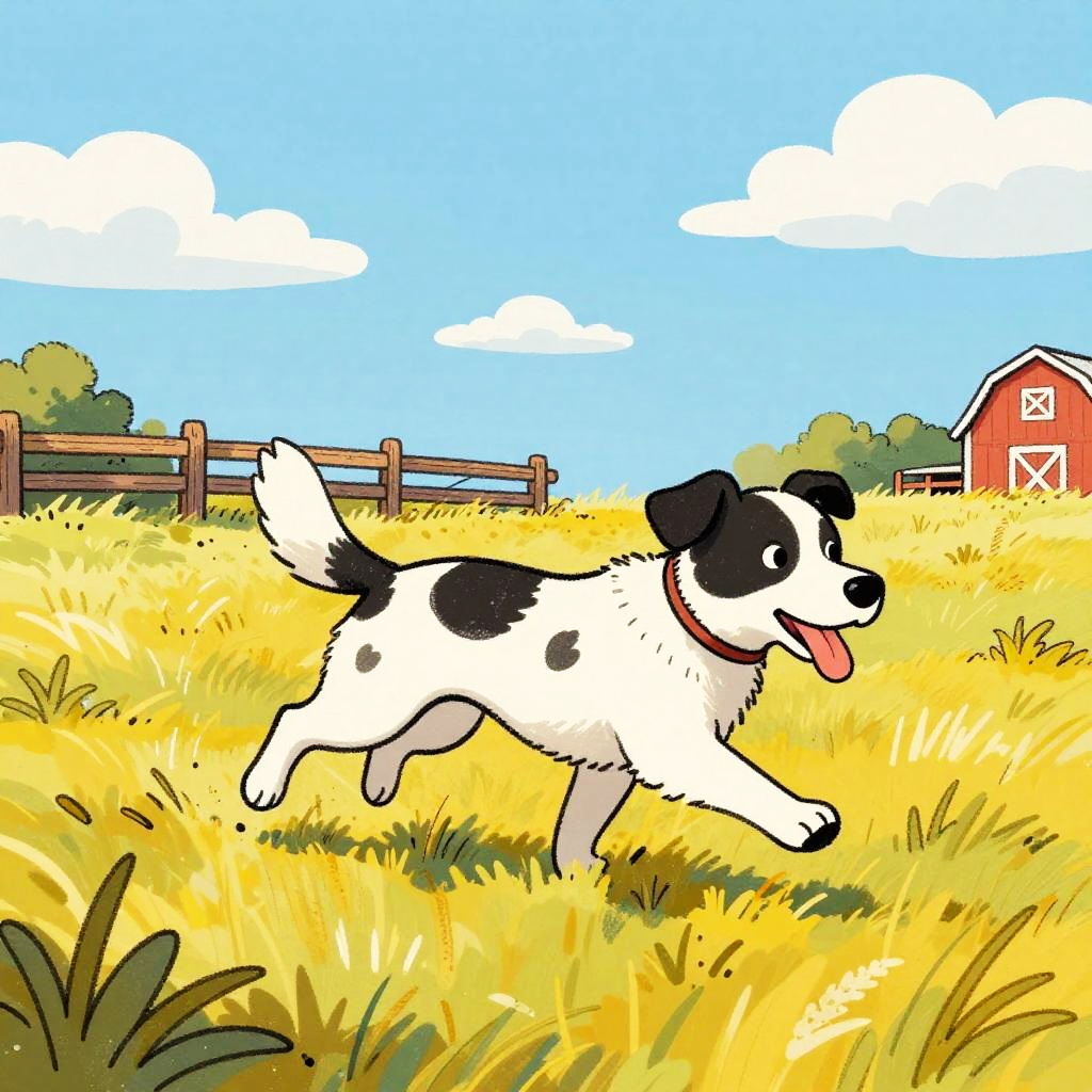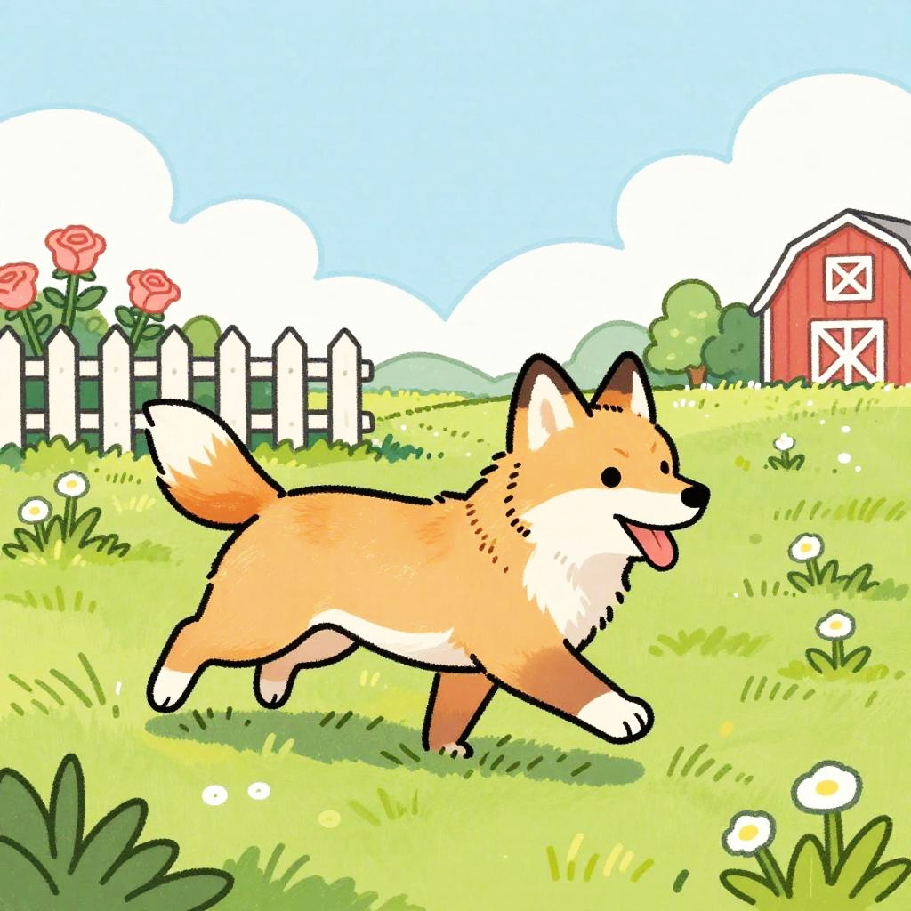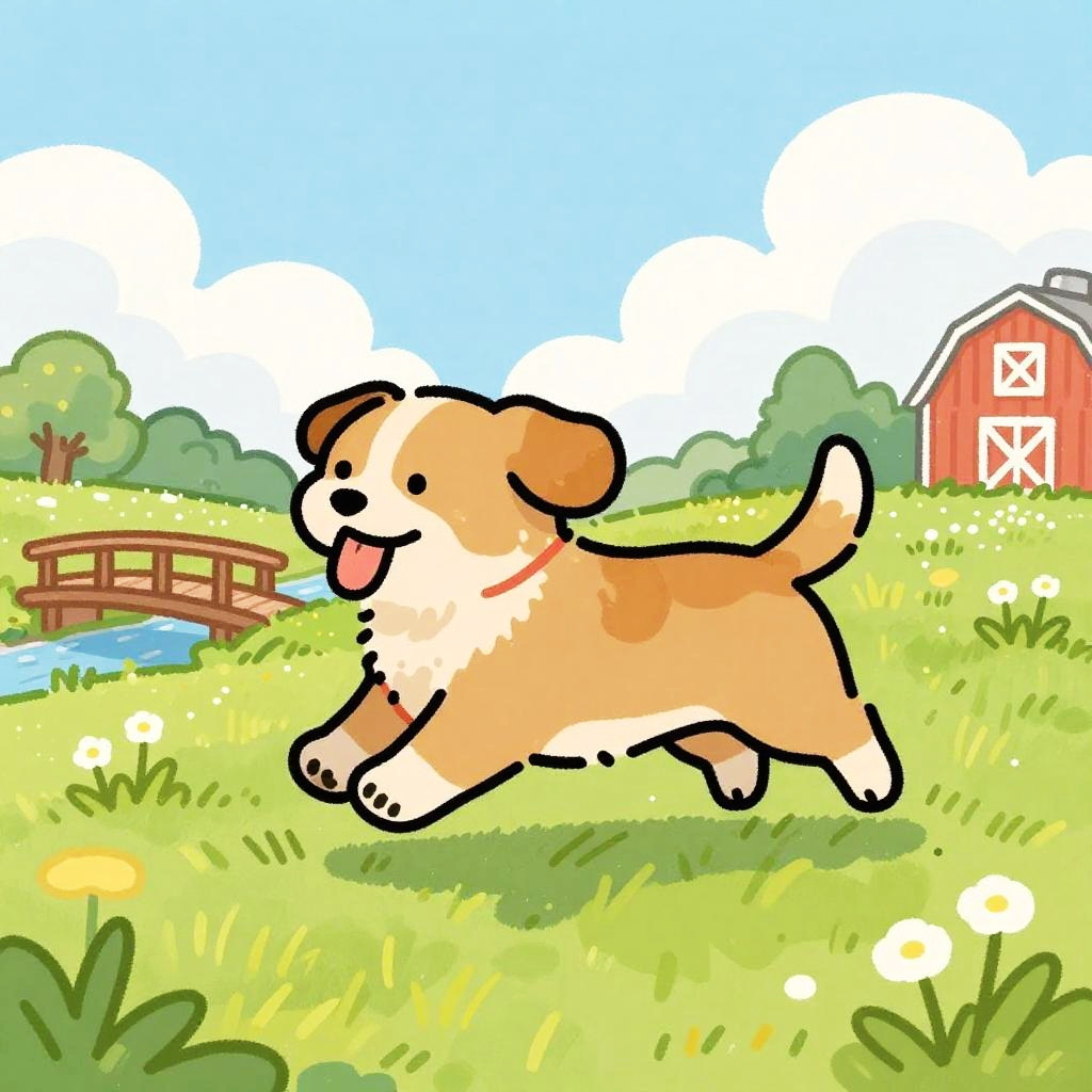 This is a colorful, hand-drawn cartoon of a Pony running through a sunlit, grassy field. The dog has soft chestnut brown fur with a white mane and is mid-stride, with its tongue out and ears back. Behind the dog, there's a pastel blue sky with scattered light fluffy clouds and a white wooden fence with wildflowers. The ground is golden yellow grass with patches of fresh green, with a hint of a red barn in the background. The drawing has a playful, sketchy style with bold, vibrant colors.