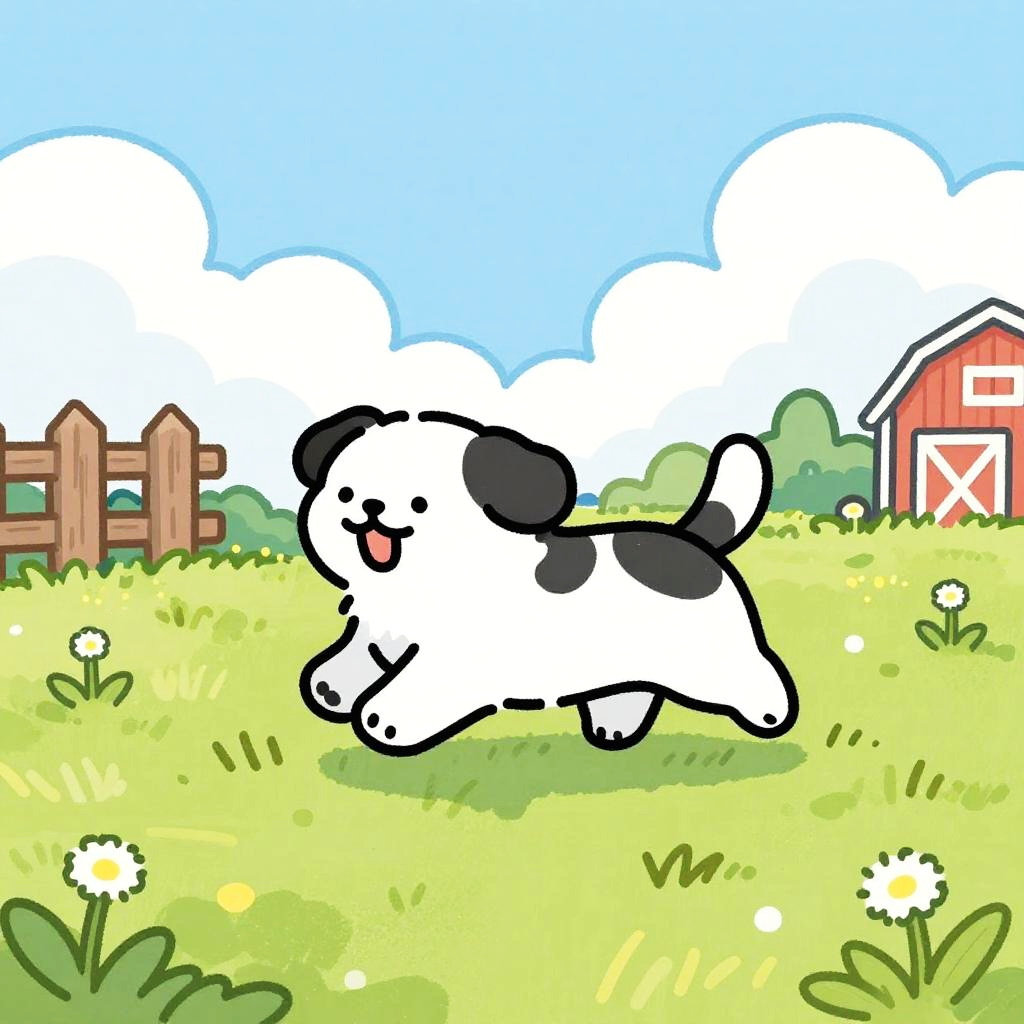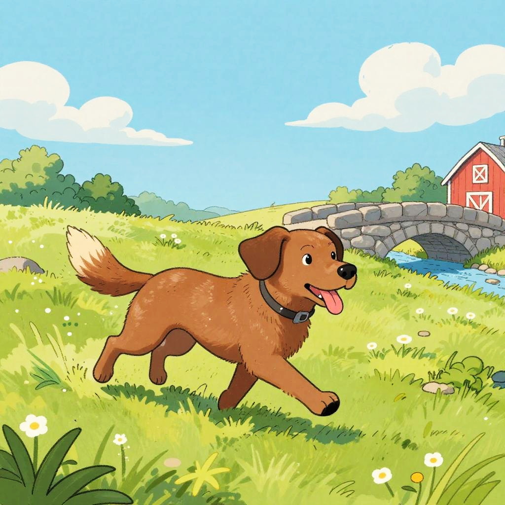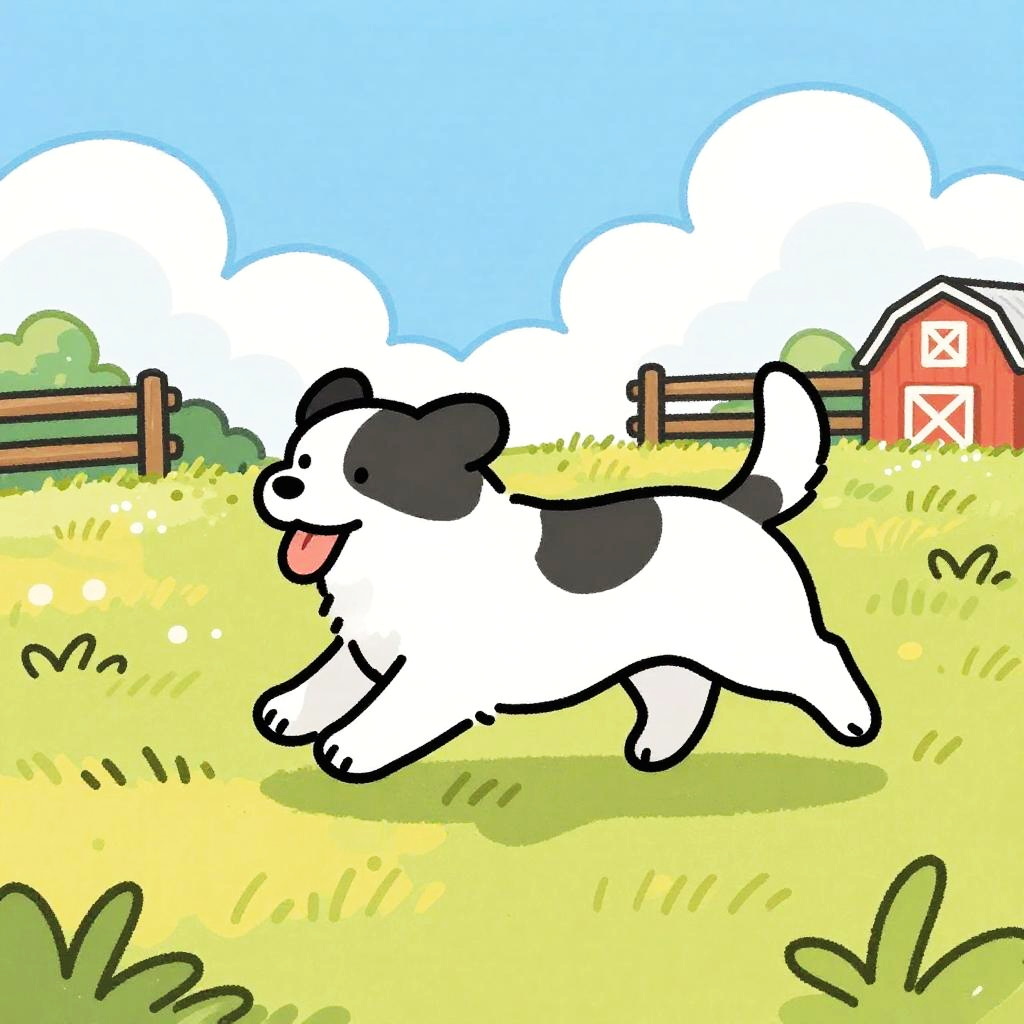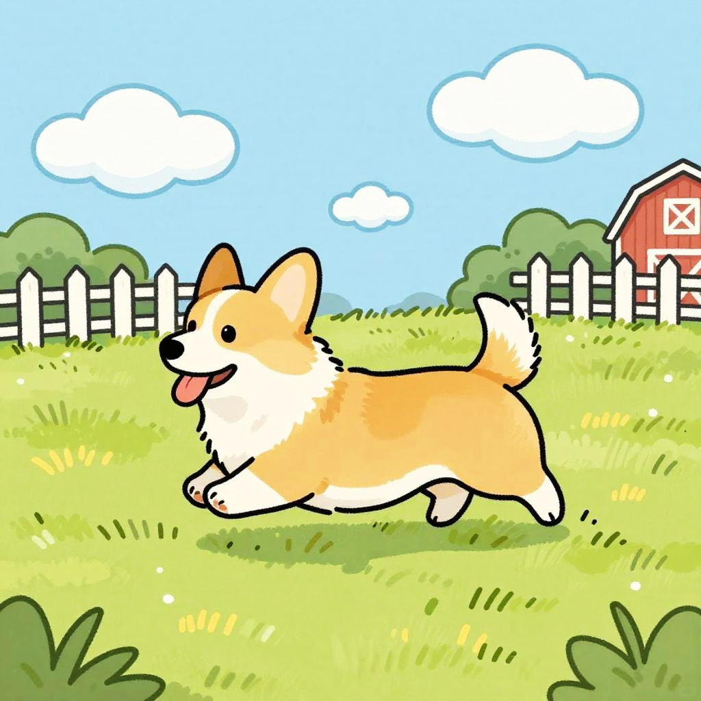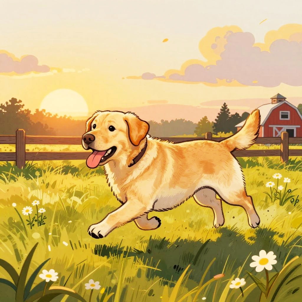 This is a colorful, hand-drawn cartoon of a Pony running through a sunlit, grassy field. The dog has soft chestnut brown fur with a white mane and is mid-stride, with its tongue out and ears back. Behind the dog, there's a pastel blue sky with scattered light fluffy clouds and a white wooden fence with wildflowers. The ground is golden yellow grass with patches of fresh green, with a hint of a red barn in the background. The drawing has a playful, sketchy style with bold, vibrant colors.