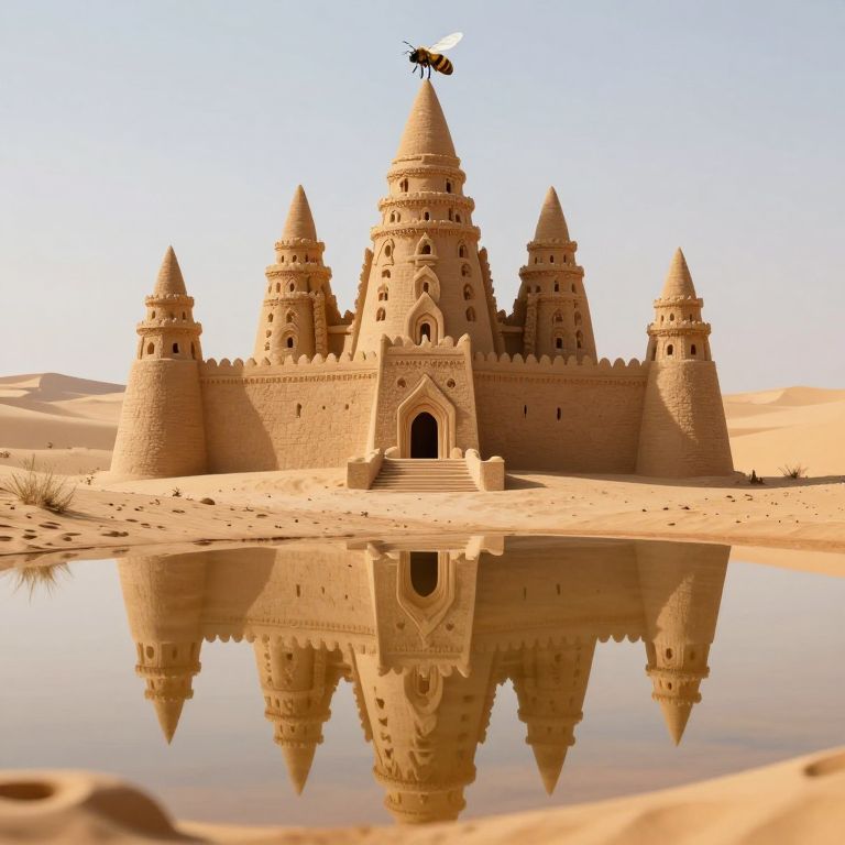 In a surreal desert mirage, towering sandcastles crafted with impossible precision rise from a reflective pool, their intricate facades mirrored perfectly below, while a solitary bee defies scale and logic by perching atop the grand edifice.